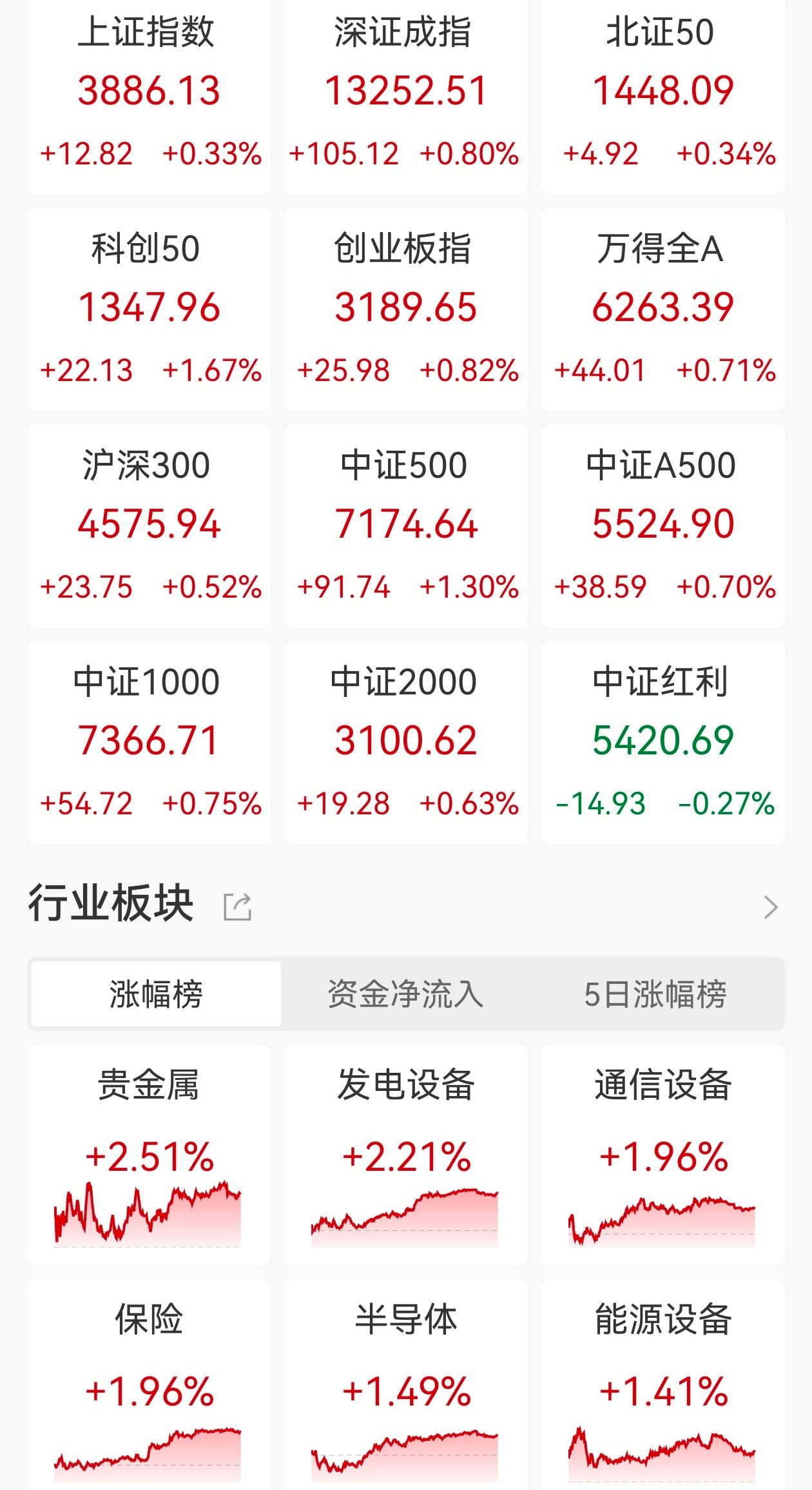 A股三大指数今日震荡上行,截至收盘,沪指涨0.41%报3889点,深证成指涨0.84%,创业板指涨0.97%。全市场成交额2.12万亿元,较前一交易日增量2338亿元,近2700股上涨。