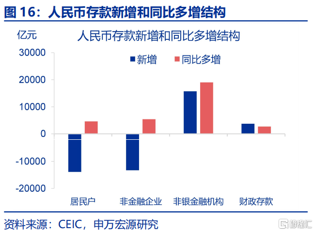 4月M2同比上行1.0个百分点至8.0%,新口径M1同比下降0.1个百分点至1.5%。存款结构中,居民存款减少13900亿,同比少减4600亿,企业存款减少13297亿,同比少减5428亿,财政存款新增3710亿,同比多增2729亿,非银存款新增15710亿,同比多增19010亿。