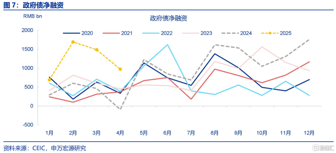 4月社融存量同比增速回升0.3个百分点至8.7%,结构上呈现“政府债主导、企业债改善”特征。一方面,企业债券(4月新增2340亿,同比多增633亿,而3月同比少增5142亿)改善对冲信贷偏弱,另一方面,4月政府债券新增9729亿,同比多增10666亿,连续第三个月同比多增超过1万亿,仍是支撑社融的核心动能。4月政治局会议表示“加快地方政府专项债券、超长期特别国债等发行使用”,预示后续政府债供给仍将保持强度,持续夯实社融增长基础。