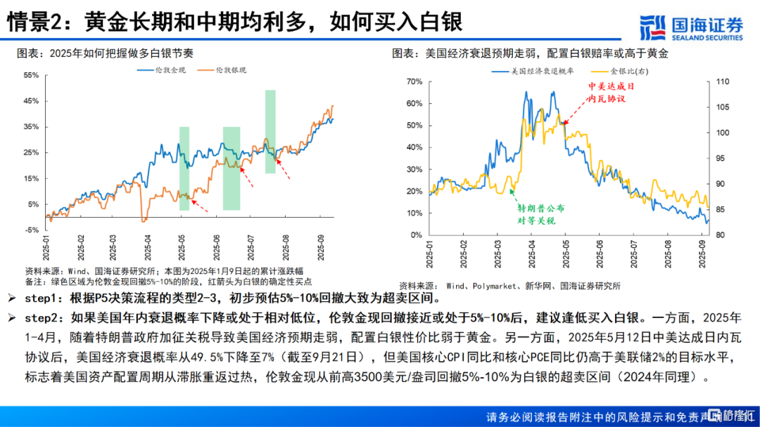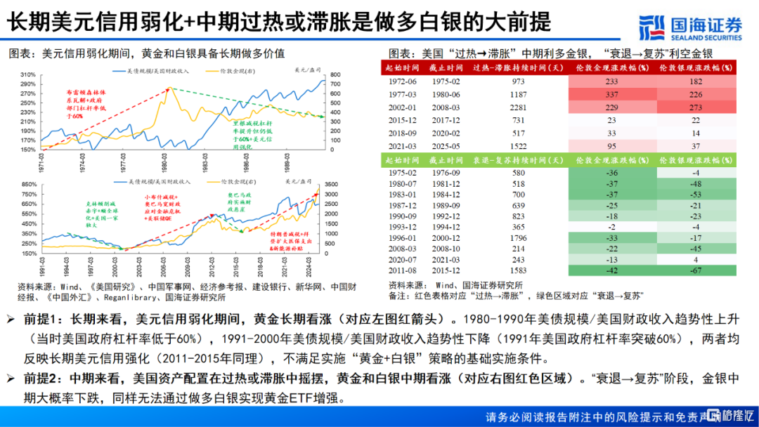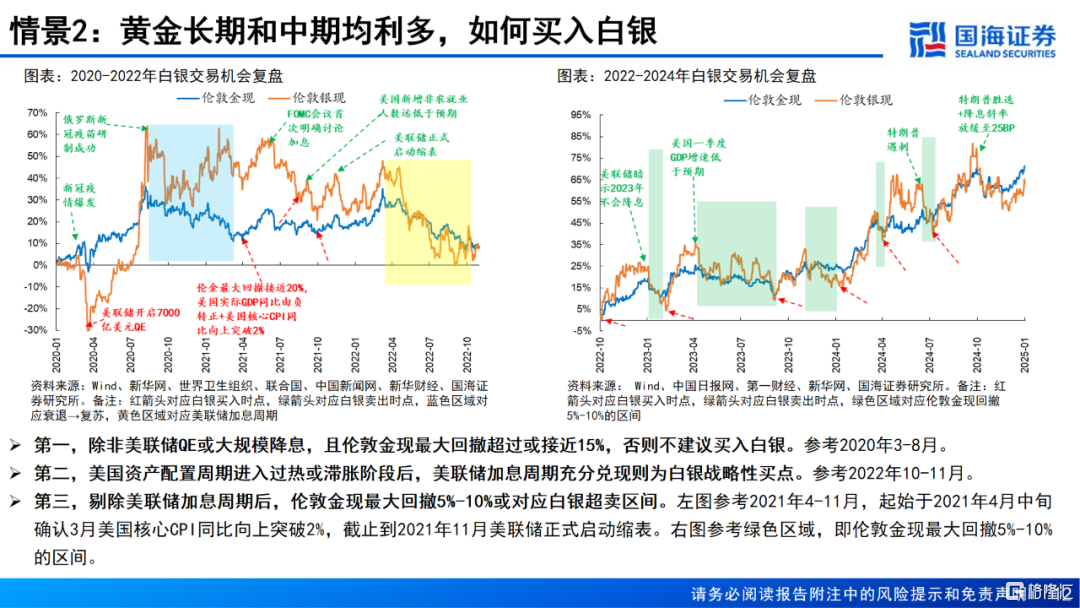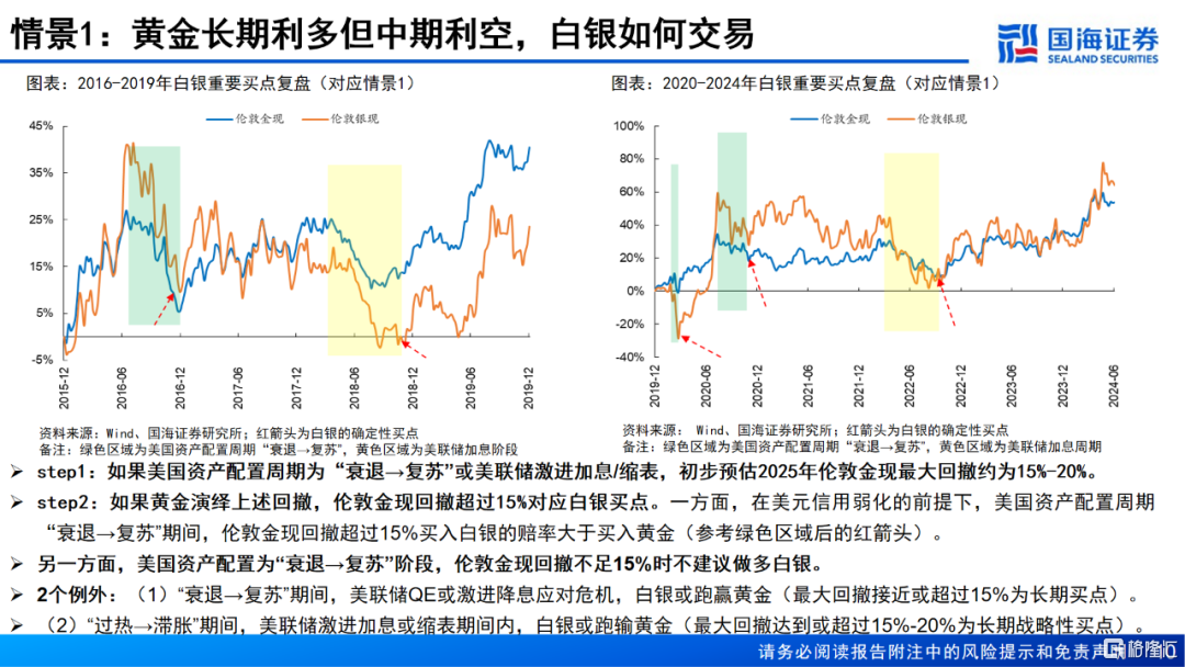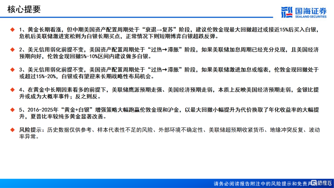 1、黄金长期看涨,但中期美国资产配置周期处于“衰退→复苏”阶段,建议伦敦金现最大回撤超过或接近15%后买入白银,危机后美联储激进宽松则为白银长期买点,正常情况下则短期博弈白银超跌反弹。