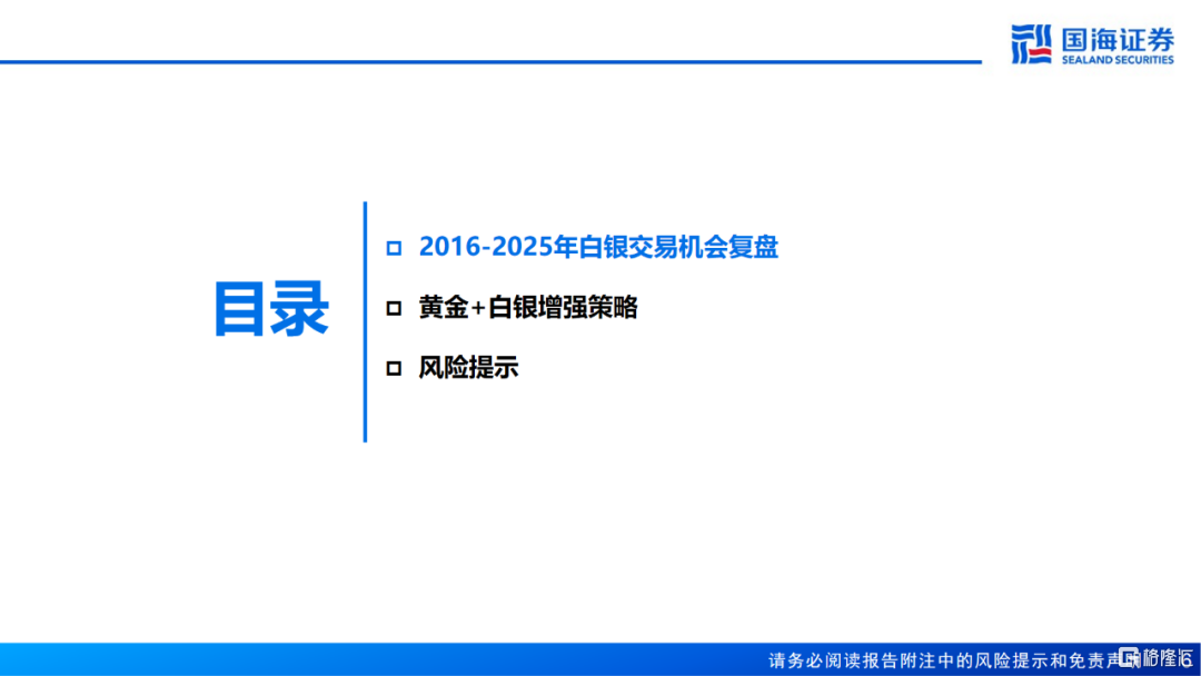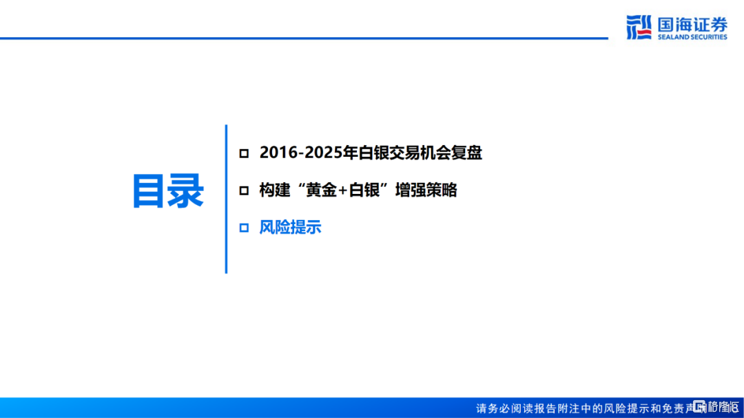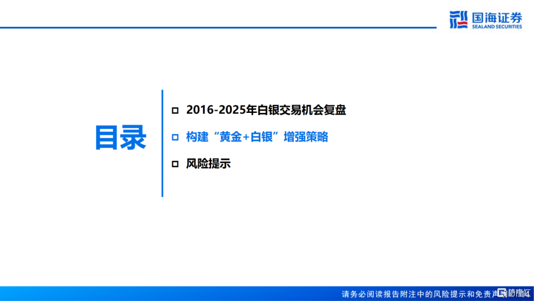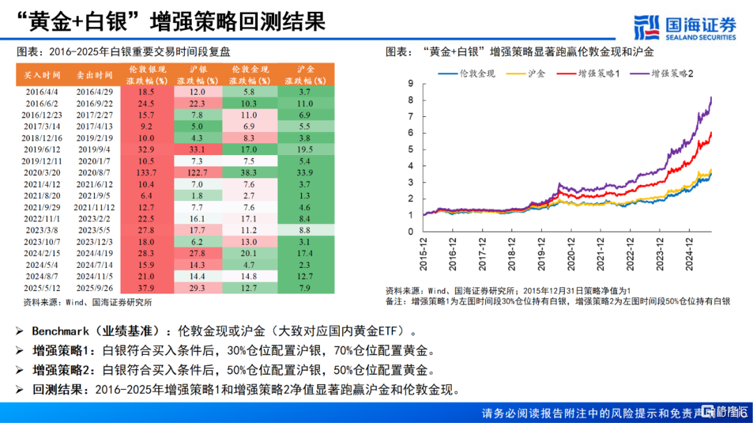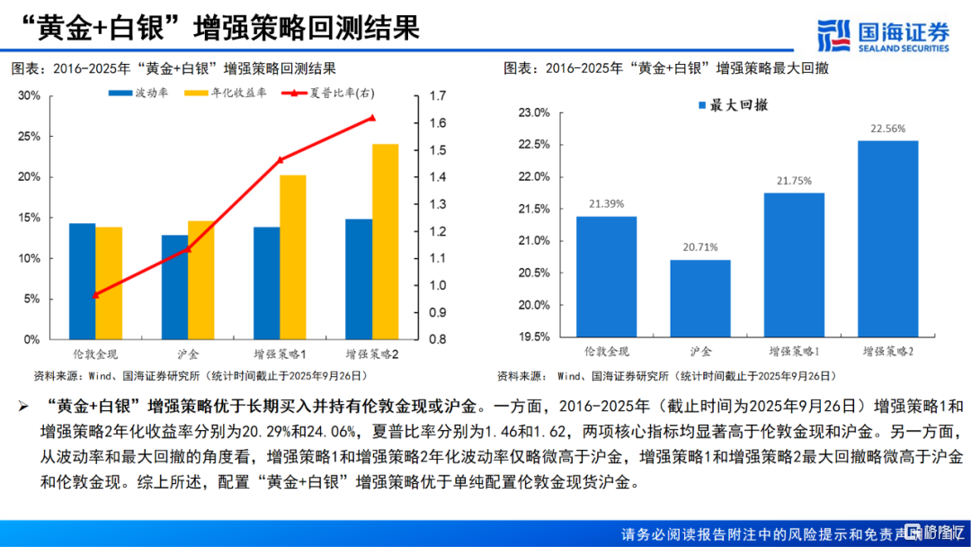 5、2016-2025年“黄金+白银”增强策略大幅跑赢伦敦金现和沪金,以最大回撤小幅提升为代价换取了年化收益率的大幅提升,夏普比率较纯多黄金显著改善。