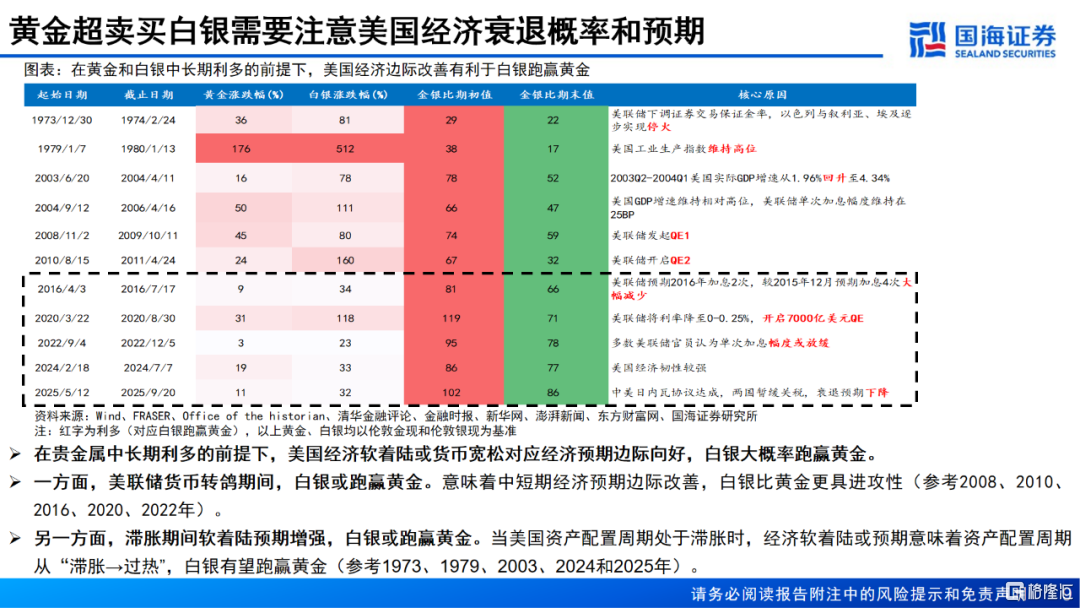 4、在黄金中长期因素看多的前提下,美联储鹰派预期走强、美国经济预期走弱,本质上反映美国经济预期走弱,金银比提升或成为大概率事件;反之则反。