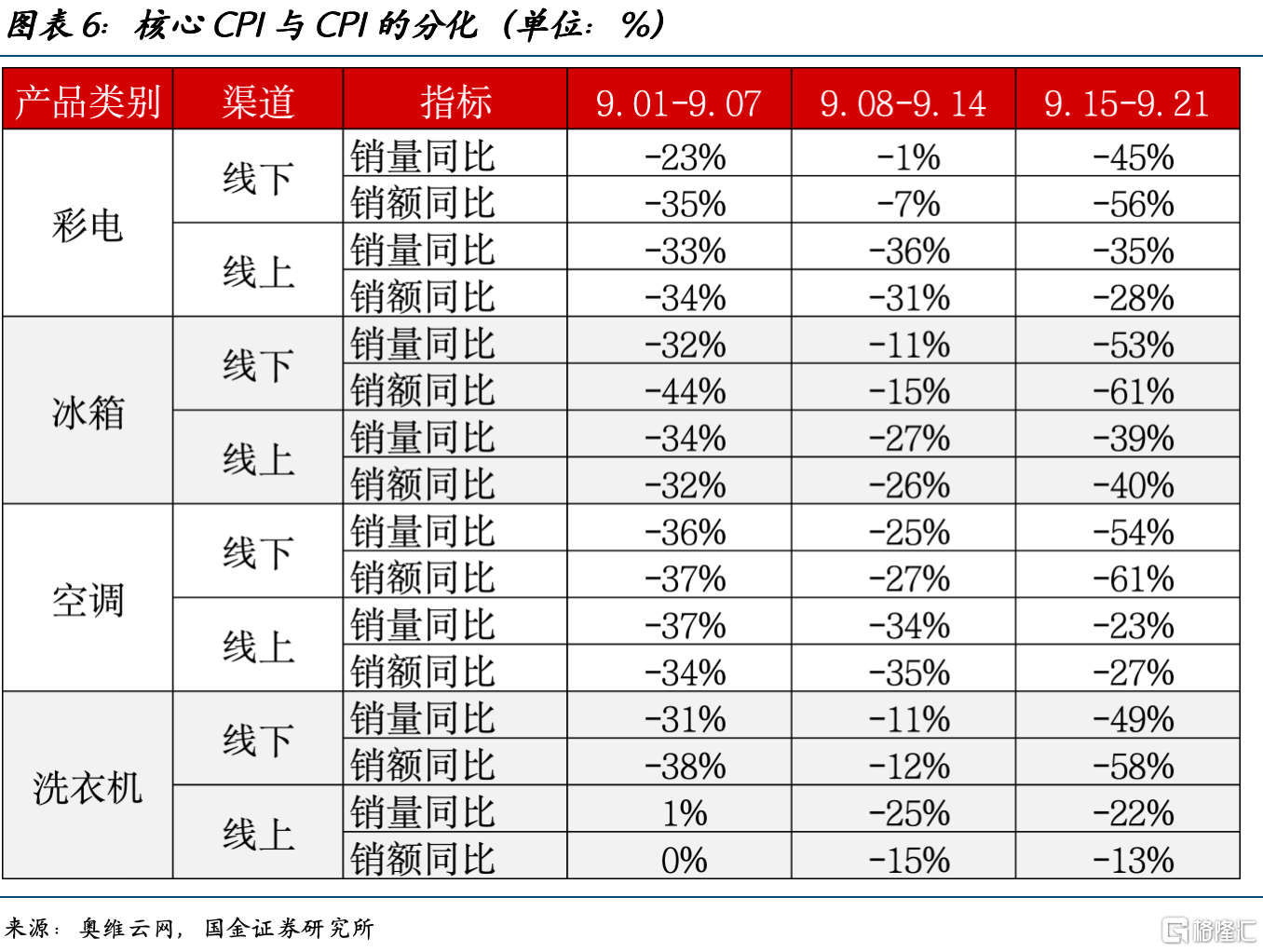 奥维云网(AVC)监测数据显示,9.01-9.14期间线上监测零售额同比-16.0%,线下监测零售额同比-23.5%。9月第三周,彩电、冰箱、空调、洗衣机等主要商品销量增速持续偏低。