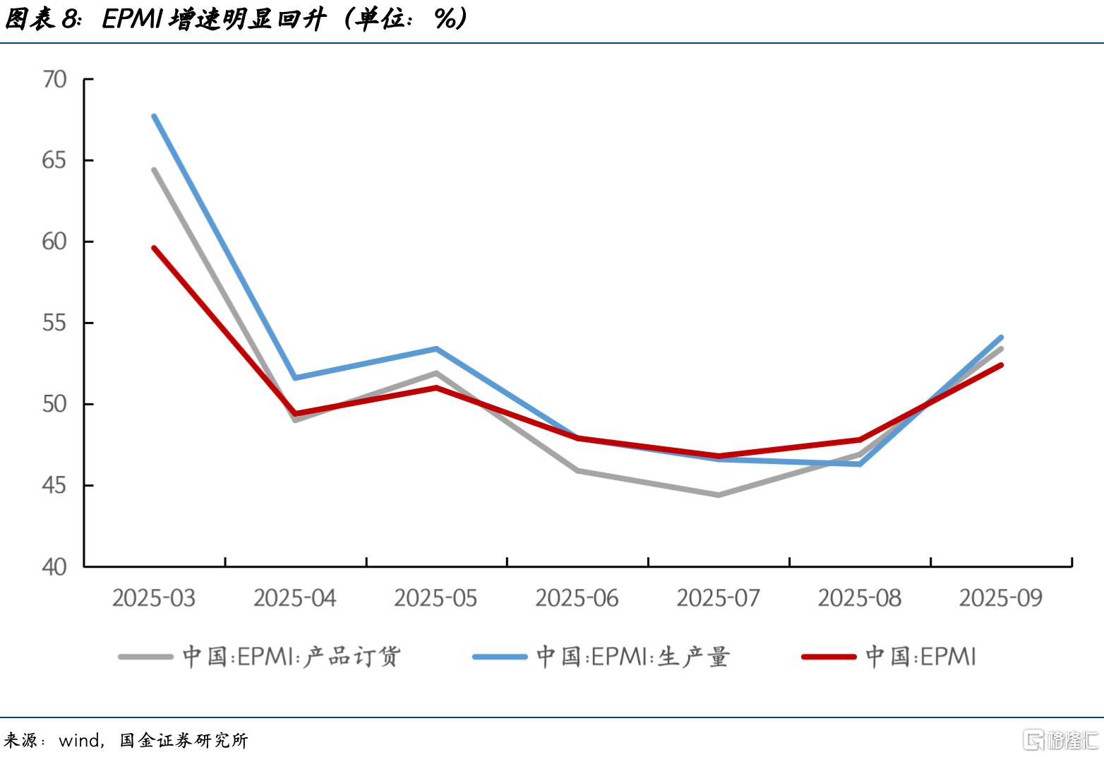 9月EPMI环比上行4.6个点至52.4,生产量、产品订货环比也明显上行。受益于政策对信贷投放力度的强调,企业融资环境指数继续上行1.2个百分点至47.6%。