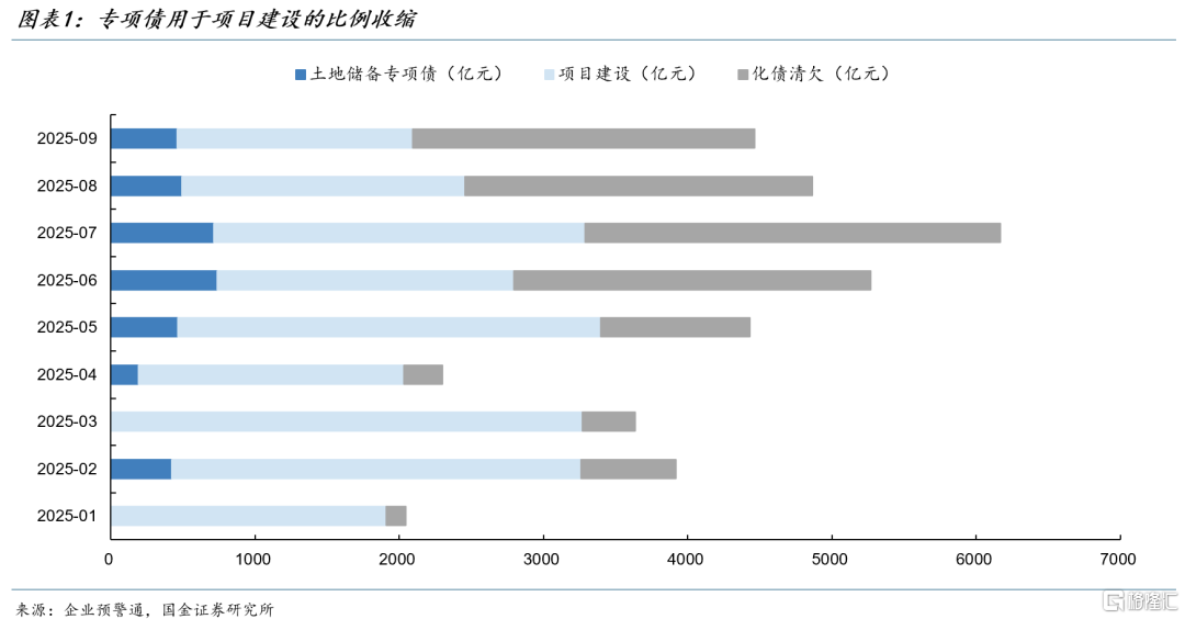 今年专项债发行速度较快,用于项目建设的比例收缩,用于化债清欠的比例上升。截至9月29日,专项债用于化债清欠的规模已超过1.2万亿,而用于项目建设的规模约2.1万亿,低于去年同期的2.8万亿。此外,年初至今城投债净融资持续为负,1-9月累计净融资规模为-4219亿,反映出地方政府传统基建投资的意愿持续收缩。