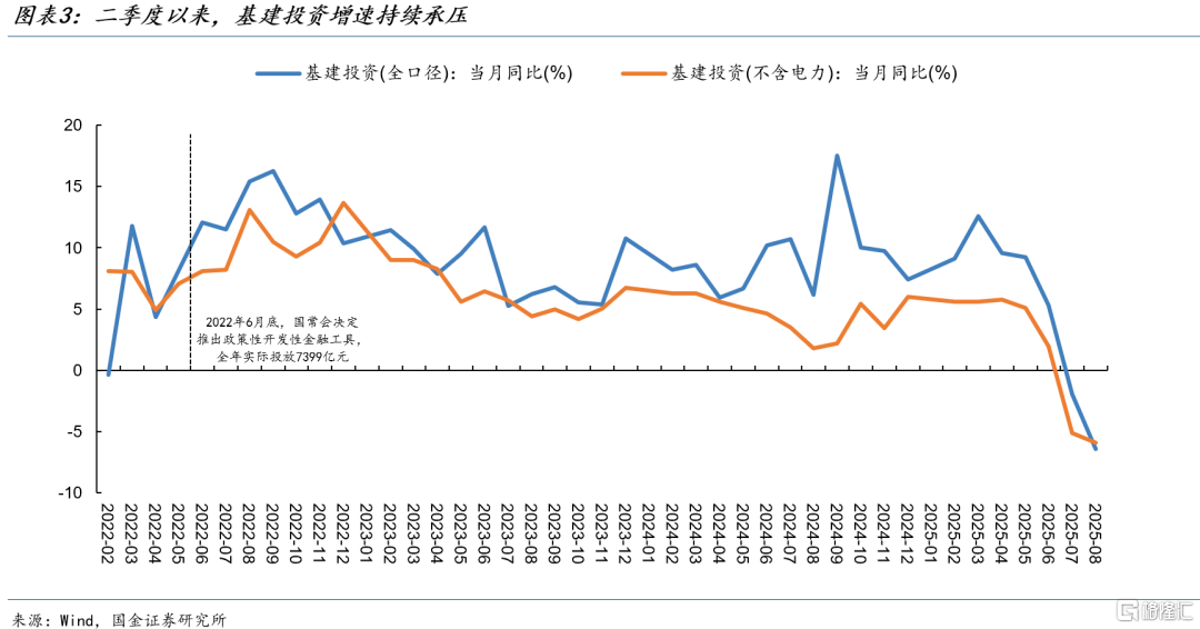 尽管今年以来基建投资增速持续回落,其中8月新、旧口径基建投资同比增速分别下滑至-5.9%、-6.4%,降幅较7月进一步走阔,但是基建投资的回落并不是因为缺钱,而是财政的重心发生变化。