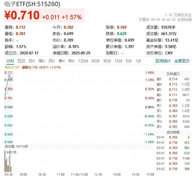 9月30日,截至9时41分,电子板块表现强劲,中证电子50指数上涨1.78%,成份股方面,江波龙领涨11.22%,兆易创新上涨6.58%,澜起科技上涨4.16%。