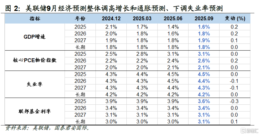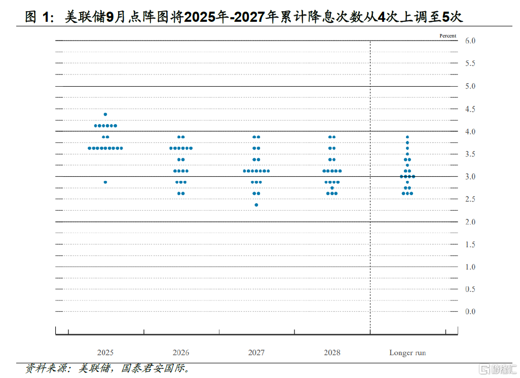 从投票的结果来看,包括7月会议投出反对票并支持立即降息的理事沃勒和鲍曼在内的十一位委员均支持降息25bp。从点阵图来看,9月点阵图将2025-2027年累计降息次数从4次上调至5次,其中2025年由2次调整为3次,但19位委员中只有9位支持降息3次,1位支持降息6次(推测大概率是米兰),人数勉强过半;对2026-2027年的利率水平仍存在较大分歧。