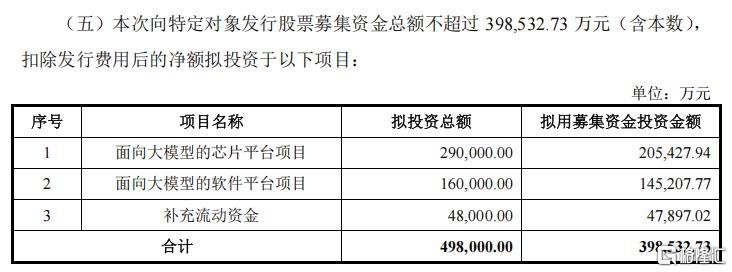 募集资金将用于面向大模型的芯片平台项目、面向大模型的软件平台项目及补充流动资金。