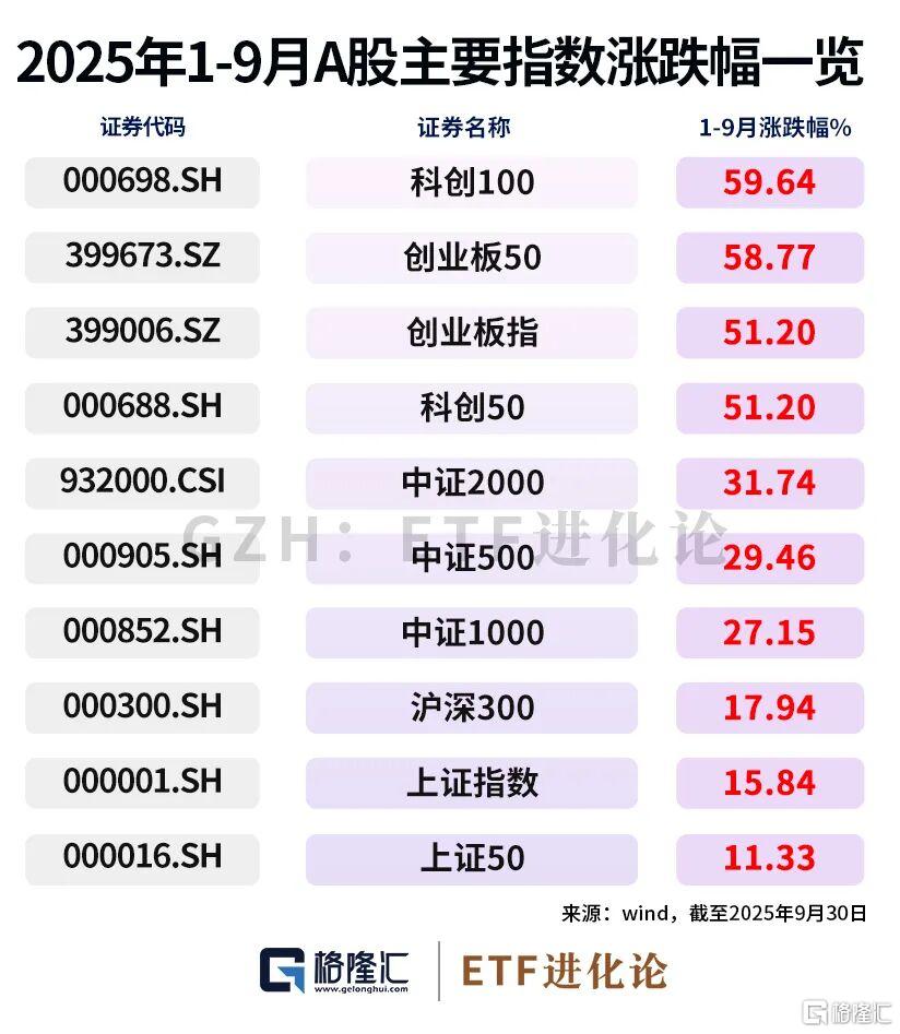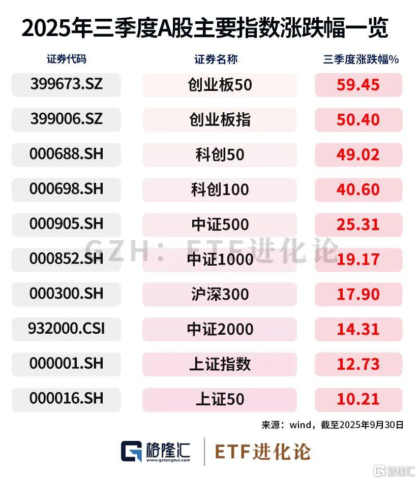 三季度,创业板50、创业板指涨超50%;科创50、科创100涨超40%。