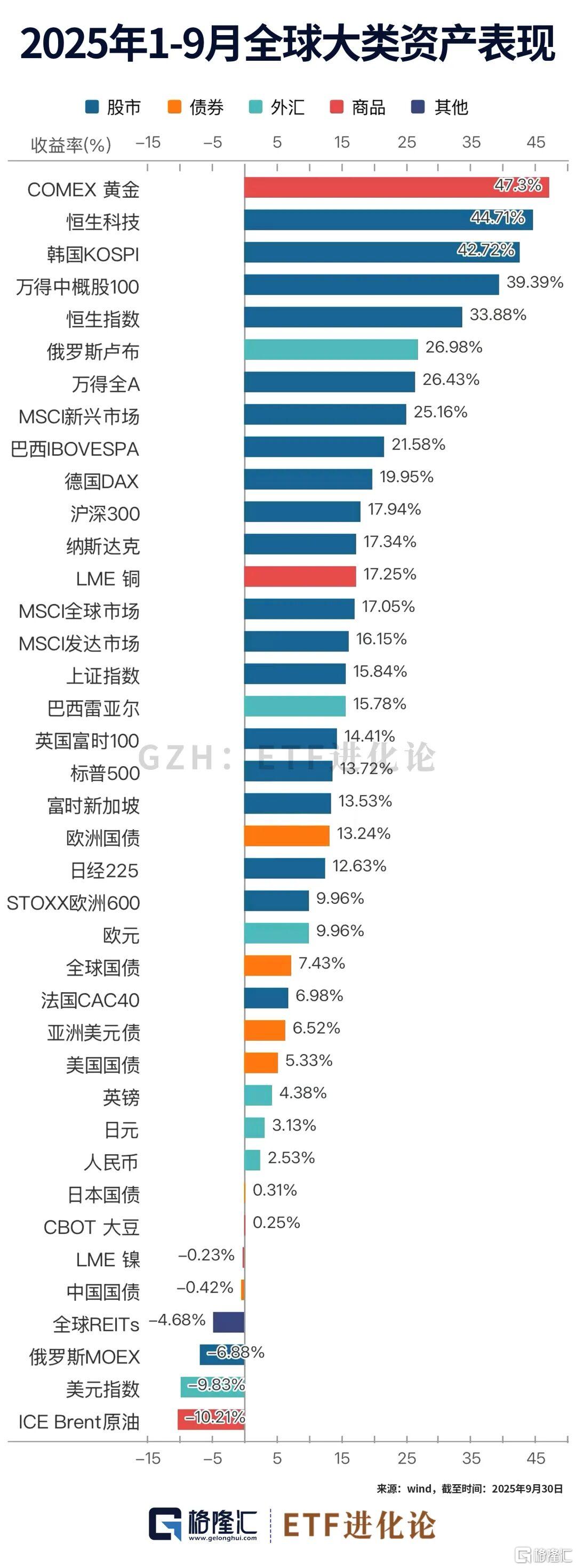 万得中概股100指数、恒生科技指数、万得全A、沪深300霸榜2025年三季度全球大类资产涨幅榜TOP4,上证指数、恒生指数紧随其后。