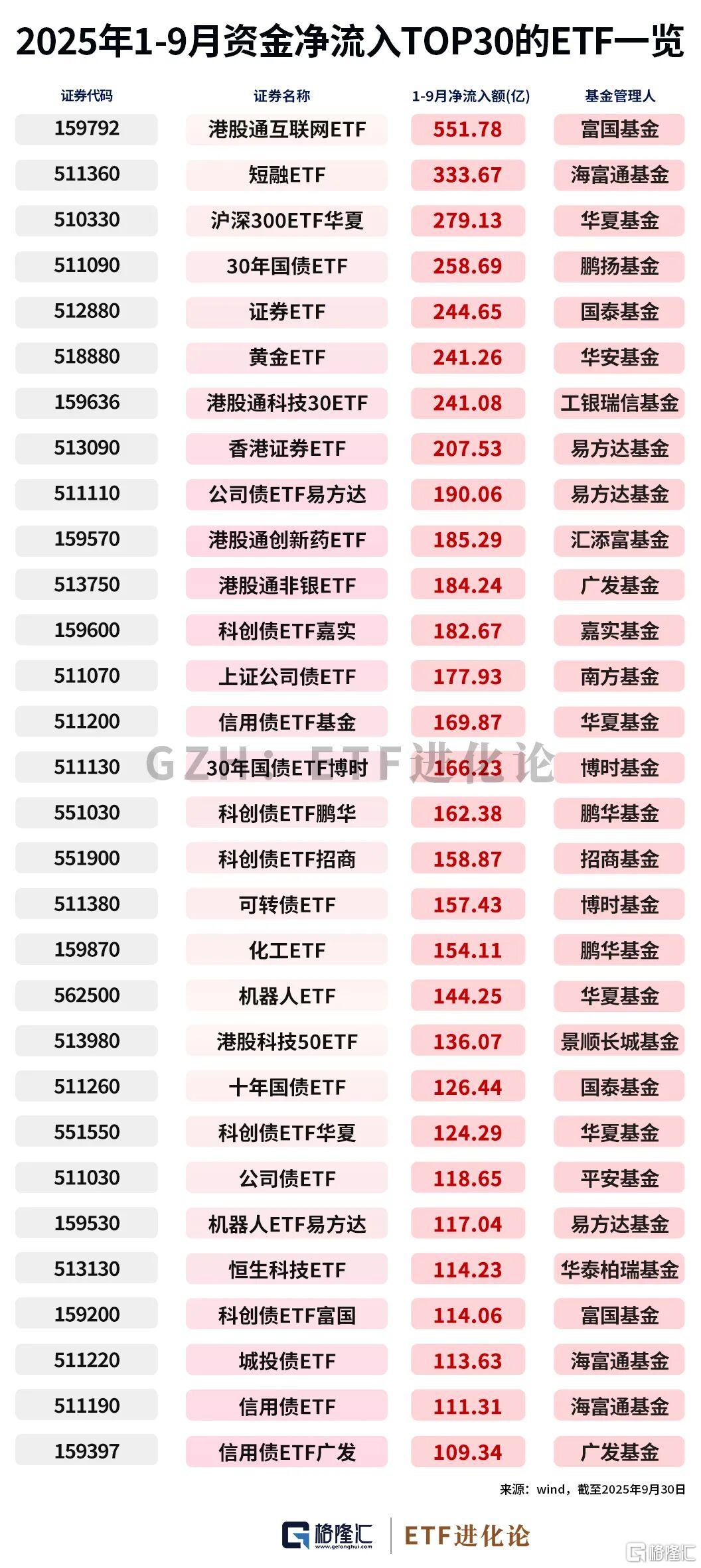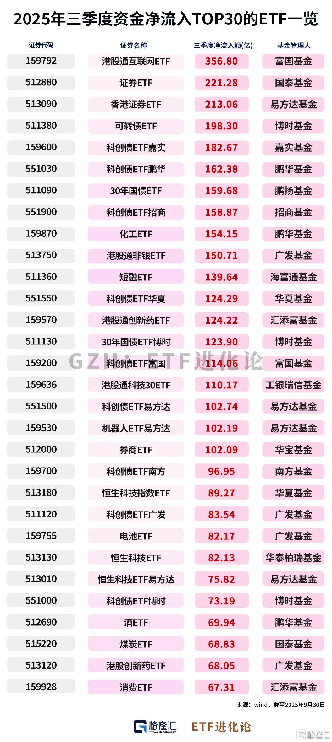 港股通互联网ETF、证券ETF、香港证券ETF、可转债ETF、科创债ETF嘉实、科创债ETF鹏华、30年国债ETF、科创债ETF招商、化工ETF、港股通非银ETF成为三季度ETF市场“吸金”主力。