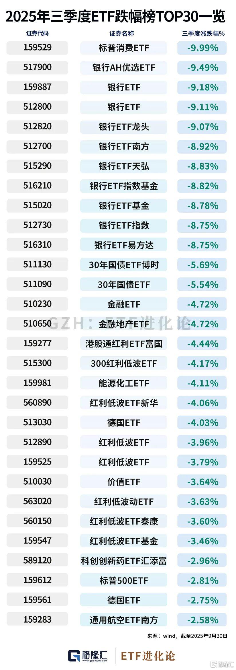 银行ETF、金融ETF、红利ETF三季度跌幅居前;能源ETF、煤炭ETF、酒ETF年内跌幅居前。