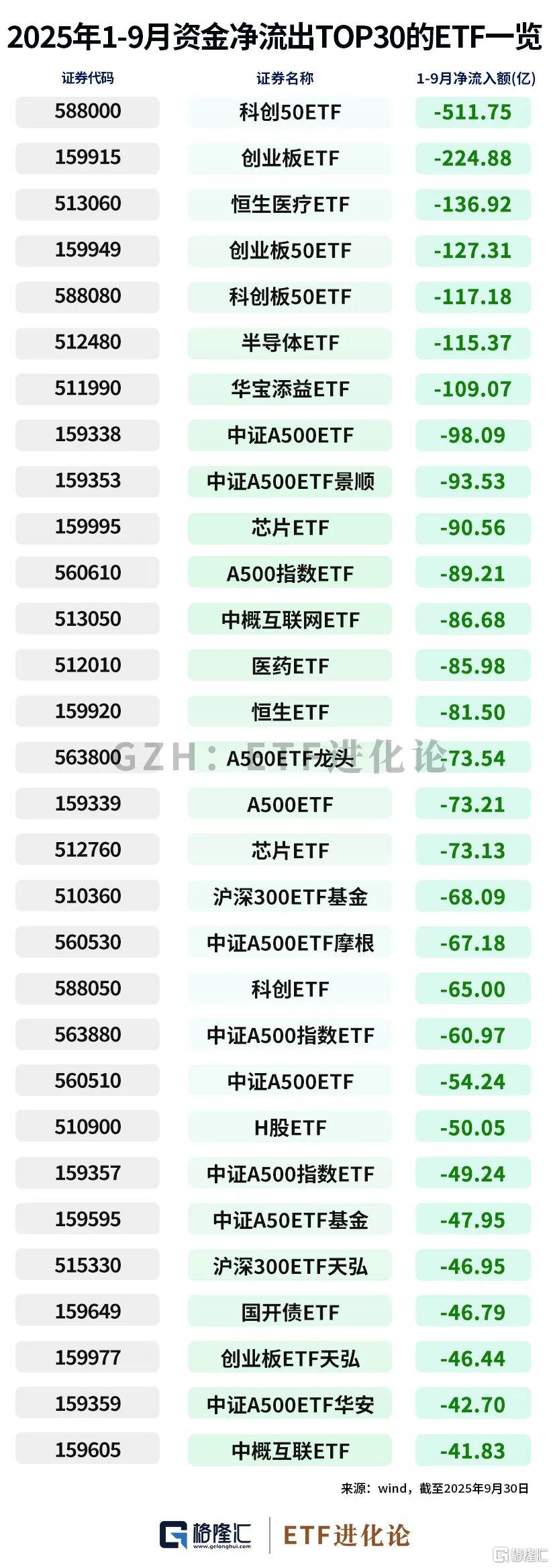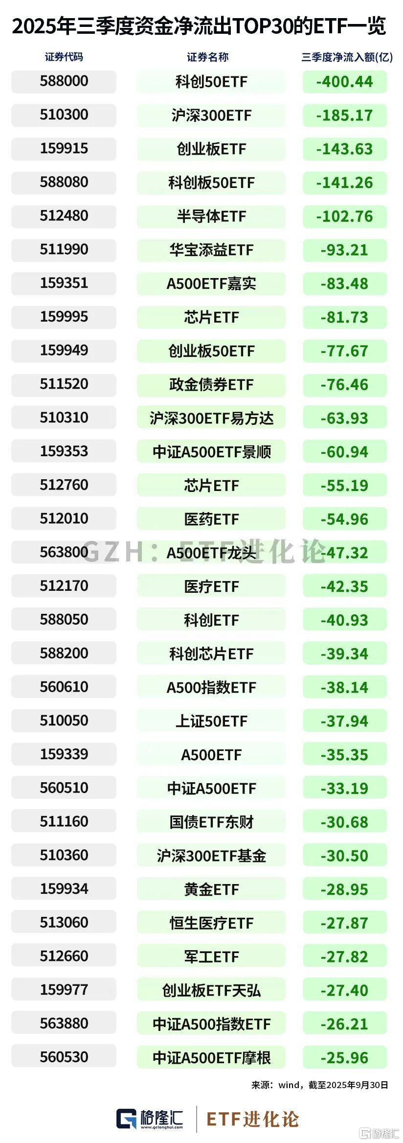 科创50ETF、沪深300ETF、创业板ETF、科创板50ETF、半导体ETF三季度资金净流出居前;年内资金净流出较多的ETF为科创50ETF、创业板ETF、恒生医疗ETF、创业板50ETF、科创板50ETF。