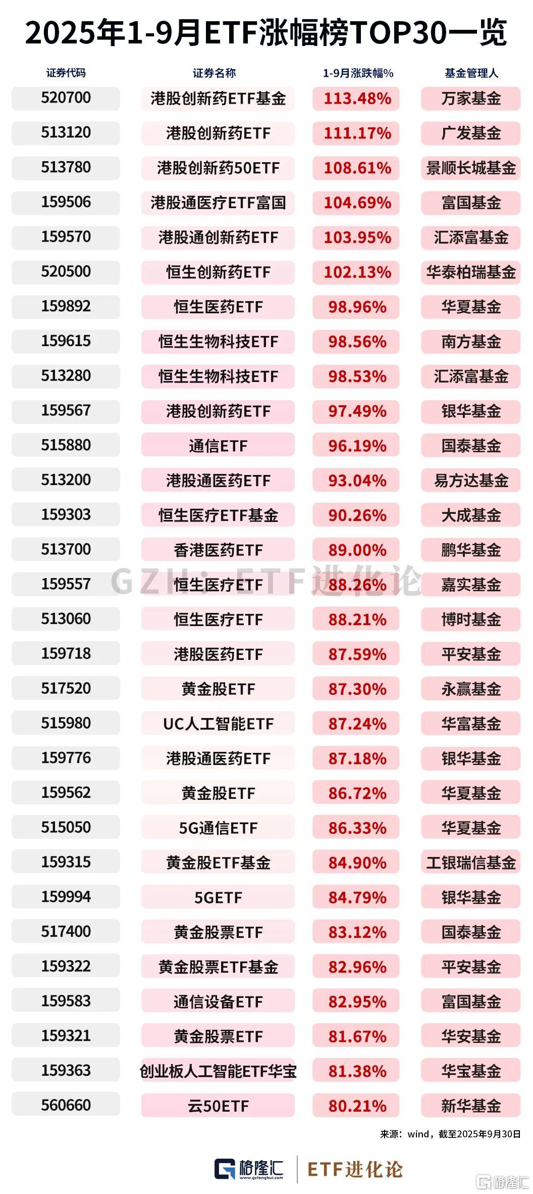 今年以来 ,港股医药领涨,港股创新药ETF、港股创新药50ETF、港股通医疗ETF富国、恒生创新药ETF翻倍;通信ETF、黄金股ETF、创业板人工智能ETF涨幅居前。