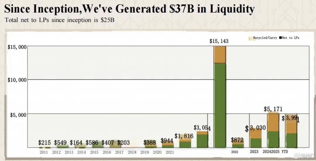 根据这份PPT显示,自2011年以来,A16z为LP们创造的净回报,也就是扣除管理费和carry这些七七八八,已经累计达到了250亿美元(约合1780亿元人民币)。总共赚的“现金”,更是高达370亿美元(约合人民币2630亿元)。