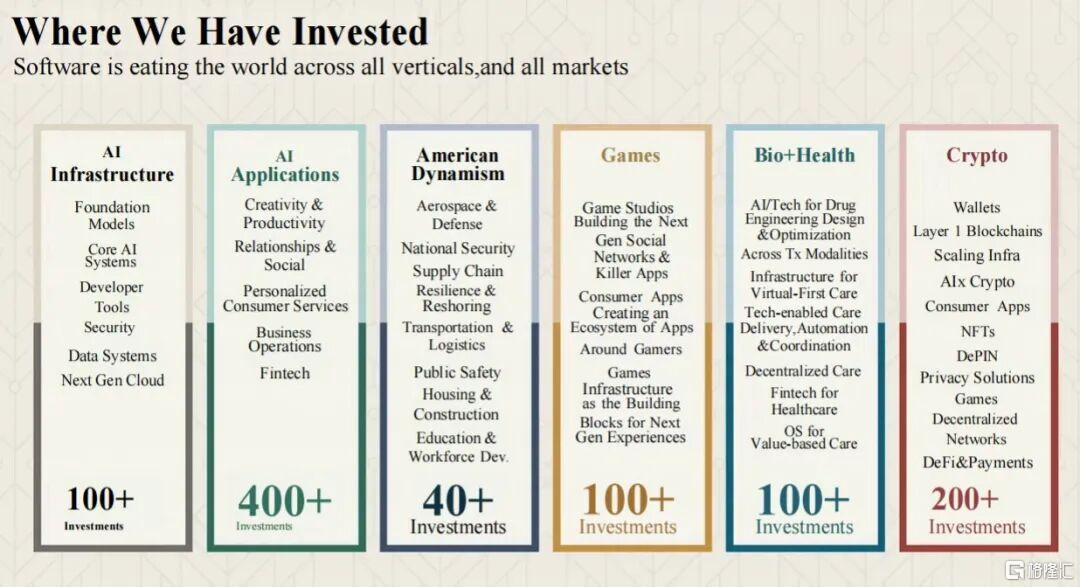 其次根据他个人的说法,他拿到的文件更新于2025年5月,而事实上2025年4月,确实有大量商业媒体爆料称A16z正在寻求一轮整体规模为200亿美元的募资。另外,根据2025年4月当时的报道,A16z这次新设立的基金主要投资于来自美国的人工智能企业,并着重希望能够吸引美国市场之外的国际资本来参与本次募资,而目前流传的这份说明文件里确实在“投资领域”一页中将“人工智能基础设施”“人工智能应用”“美国活力”标注为前三序列。