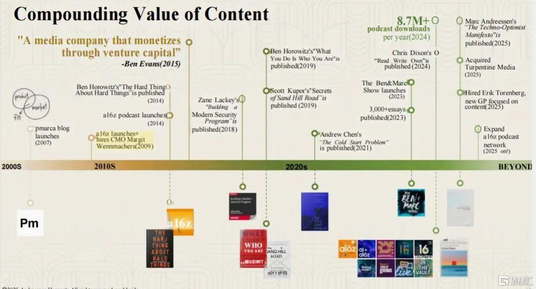 更值得玩味的是,这份PPT确实有一页专门提到了A16z的内容赋能能力,比如他们曾经专门聘请过玛吉特•温曼琪(Margit Wennmachers)出任首席媒体官,比如他们的播客下载量每年达到了870万次。他们甚至还在这一页写下了一句话:一家通过风险投资赚钱的媒体公司。