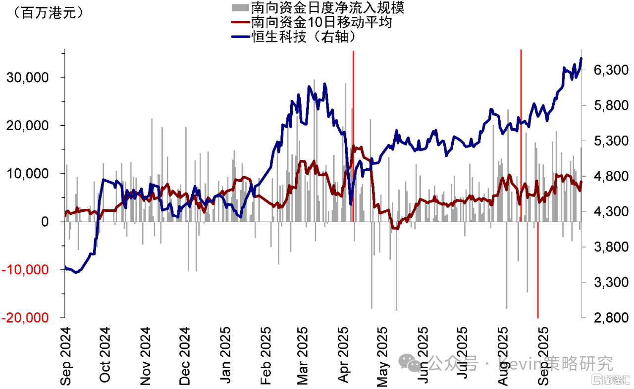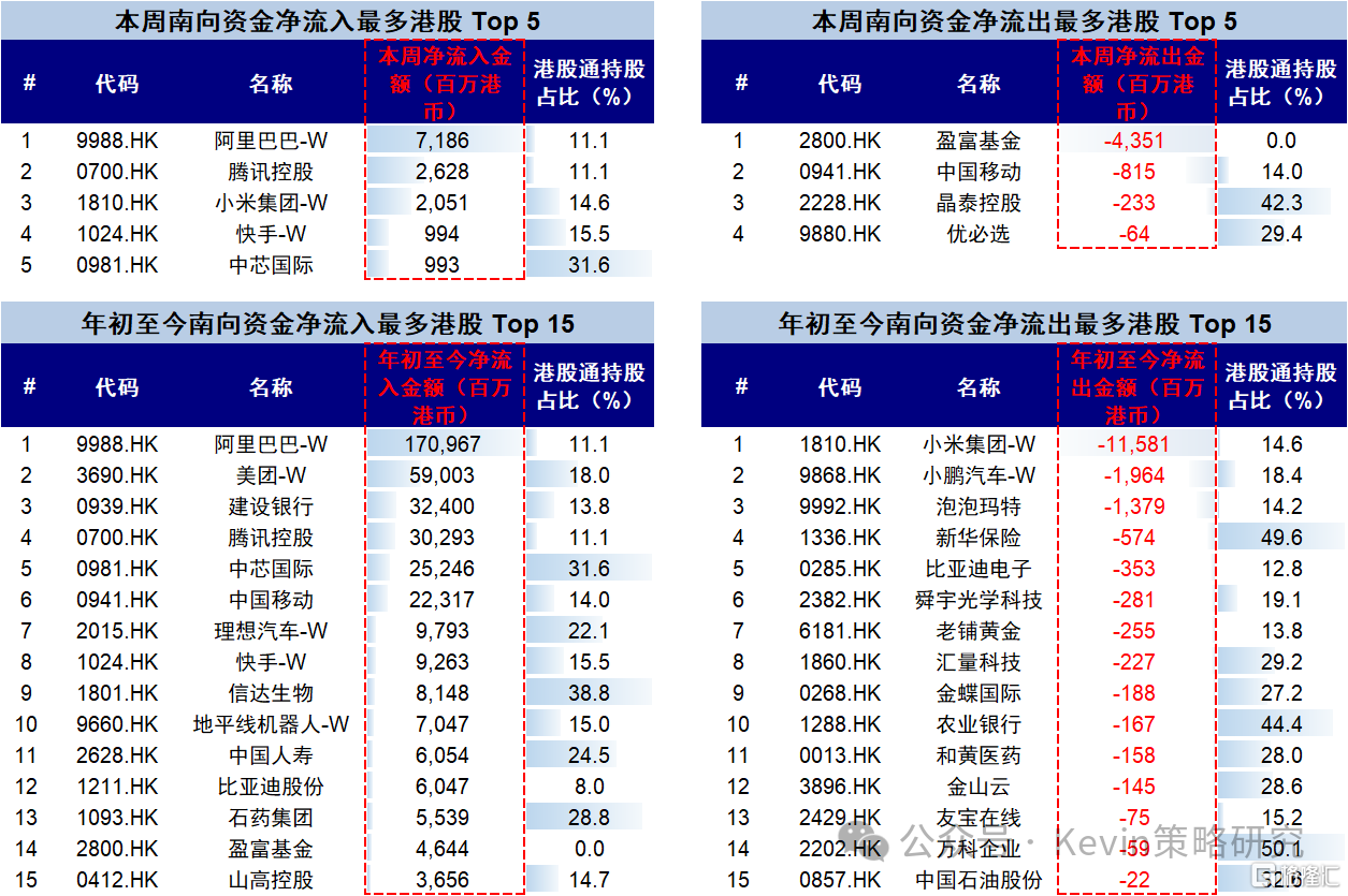 2️⃣ 南向资金节前两个交易波动较大,继周一流出16.5亿港元后,周二再度大幅回流154.8亿港元,日均流入69.1亿港元(vs. 上周日均流入87.9亿港元)。个股净增持最多为阿里、腾讯与小米,但卖出盈富基金、中国移动与晶泰控股等。