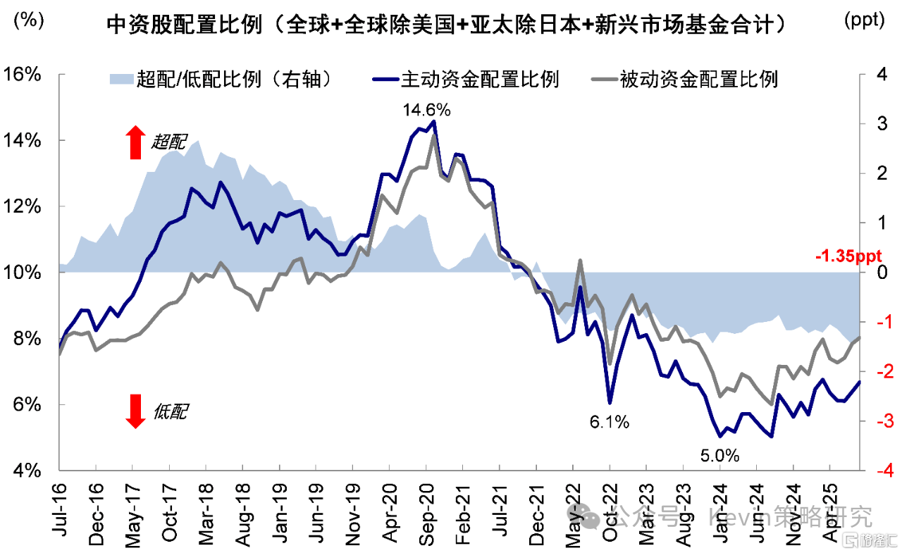 截至8月,主动外资对中国配置比例从7月6.4%升至6.7%,被动资金配置比例升至8%,低配程度从7月1.45ppt降至1.35ppt、但仍低于6月1.31ppt,表明主动资金加仓较慢。