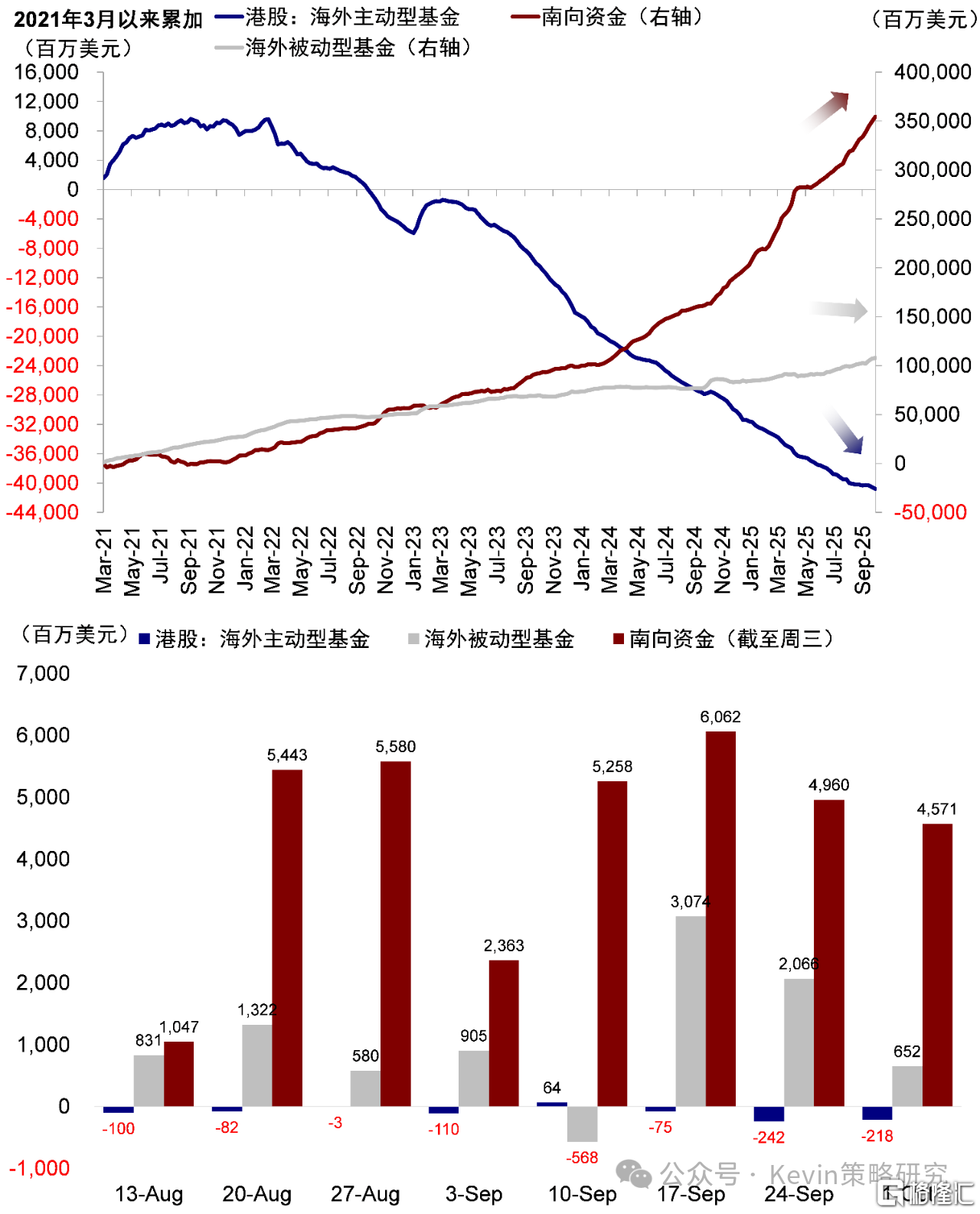 1️⃣上周主动外资继续流出A股,规模小幅放缓至0.6亿美元(vs. 上周流出0.7亿美元);海外中资股的流出规模较上周同样小幅放缓,流出2.2亿美元(vs. 上周流出2.4亿美元)。