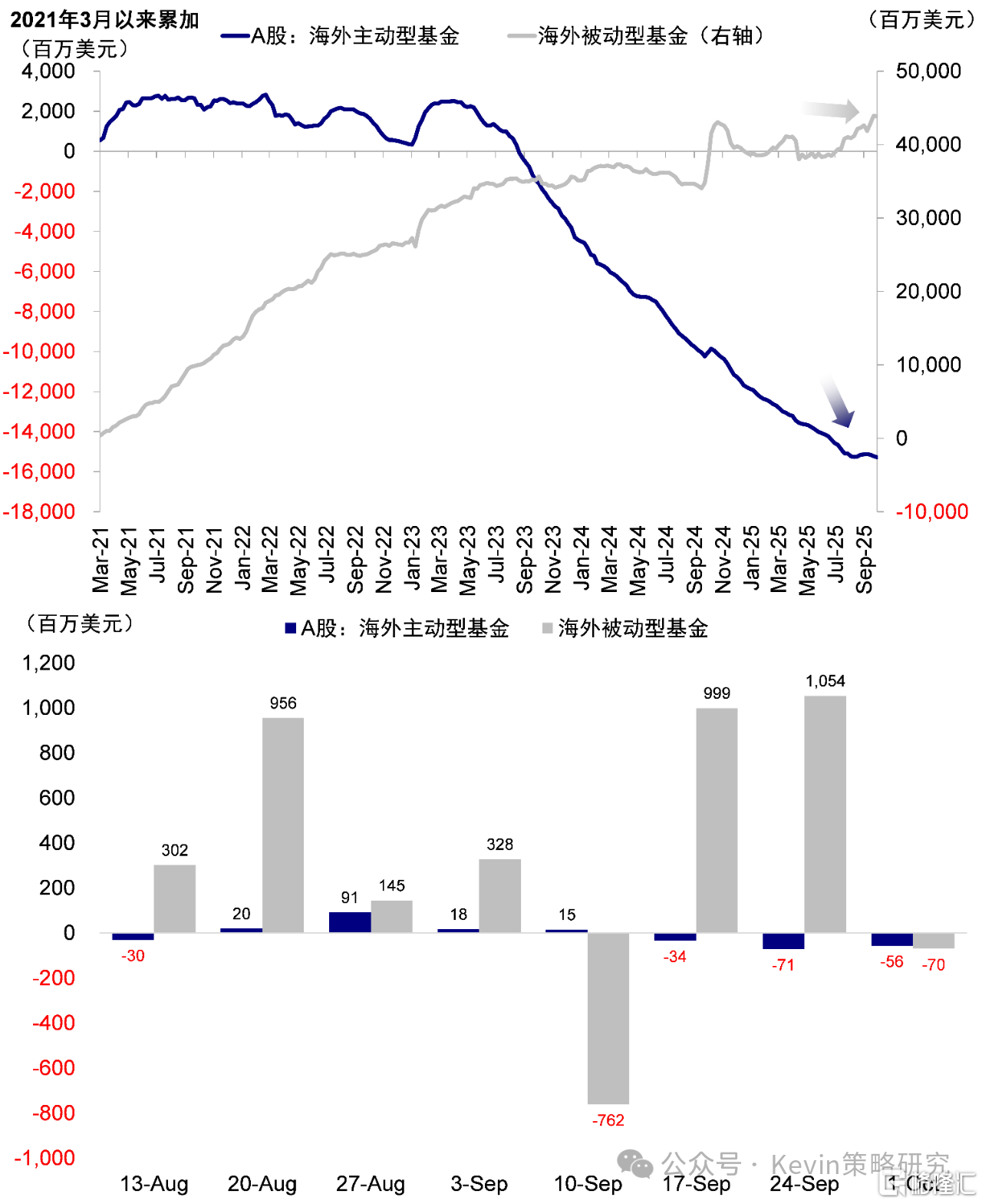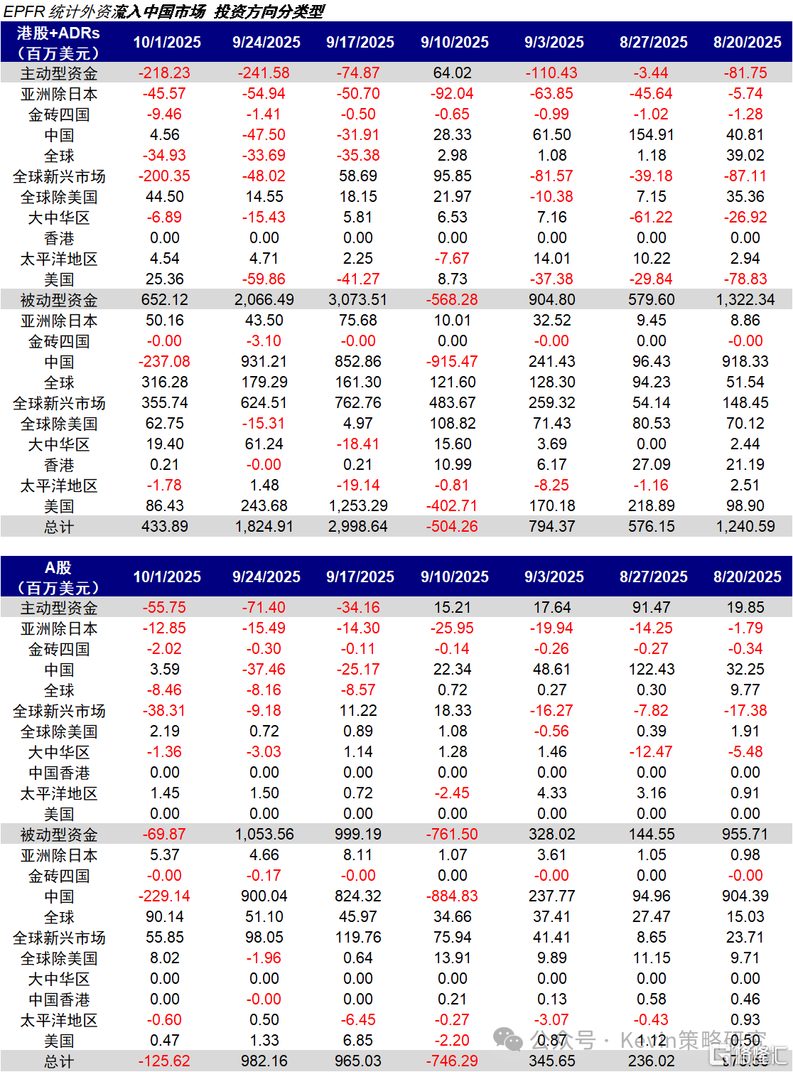 被动外资也转为流出A股,规模0.7亿美元(vs. 上周流入10.5亿美元)。不过,被动外资依然流入海外中资股,但规模放缓至6.5亿美元(vs. 上周流入20.7亿美元)。