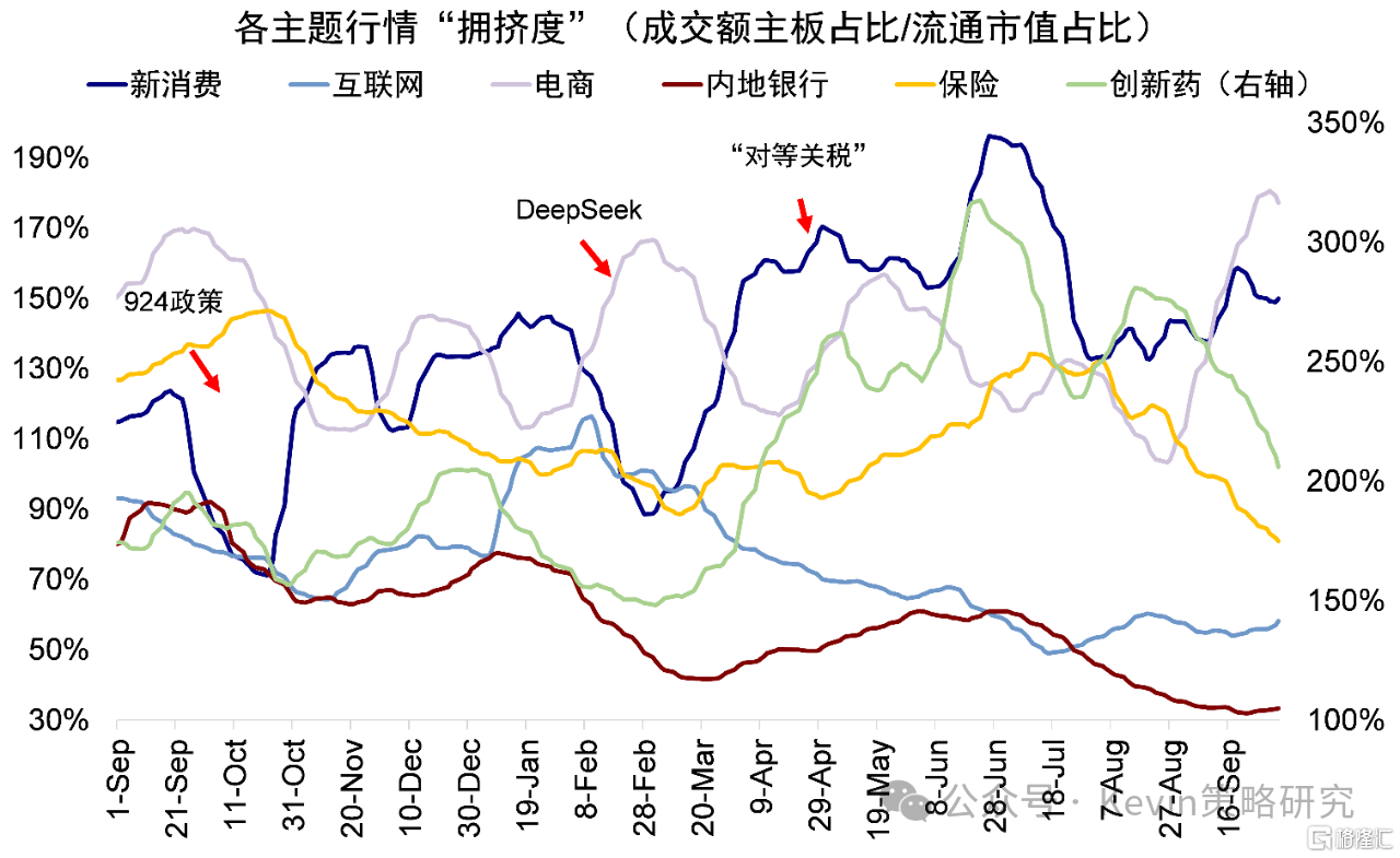 目前来看,景气方面:1)AI相关硬件和应用预期仍较强,2)继续关注中美映射方向,如投资拉动的有色和机械,地产拉动的工具与家电等。我们的拥挤度模型提示:1)电商已经偏高、互联网仍处低位,2)创新药继续回落,3)新消费仍震荡徘徊,4)银行和保险处于一年来低位。近期部分资金在拥挤度和估值维度寻找“高切低”机会,但低位的顺周期与消费还需要总量政策和基本面配合。