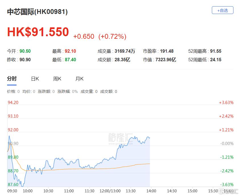 早盘一度跌3.85%的中芯国际午后转涨,最高涨1.32%触及92.1港元,股价续创历史新高,H股市值突破7300亿港元,年内累涨189.6%。