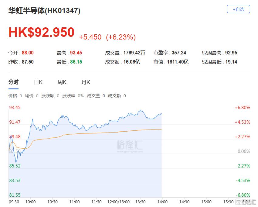 华虹半导体午后涨幅扩大至6.8%,报93.45港元,续创历史新高,H股市值突破1600亿港元,年内累涨331.6%。