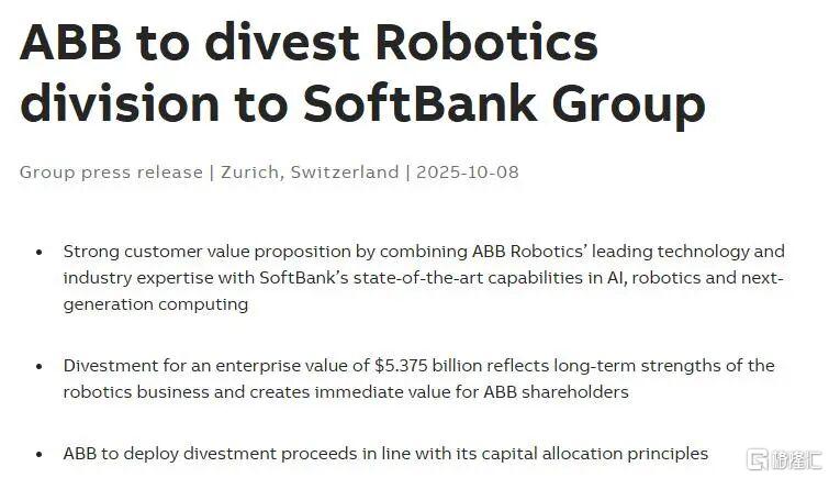 瑞士工程公司ABB周三公告,已与日本投资公司软银集团签署协议,将旗下机器人业务部门以53.75亿美元的价格出售给软银集团,不再执行先前将该业务分拆为独立上市公司的计划。软银董事长兼首席执行官孙正义指出,软银的下一个前沿领域是物理人工智能。软银将携手ABB的机器人团队,汇聚世界一流的技术和人才,将超级人工智能和机器人技术结合,推动突破性的变革。