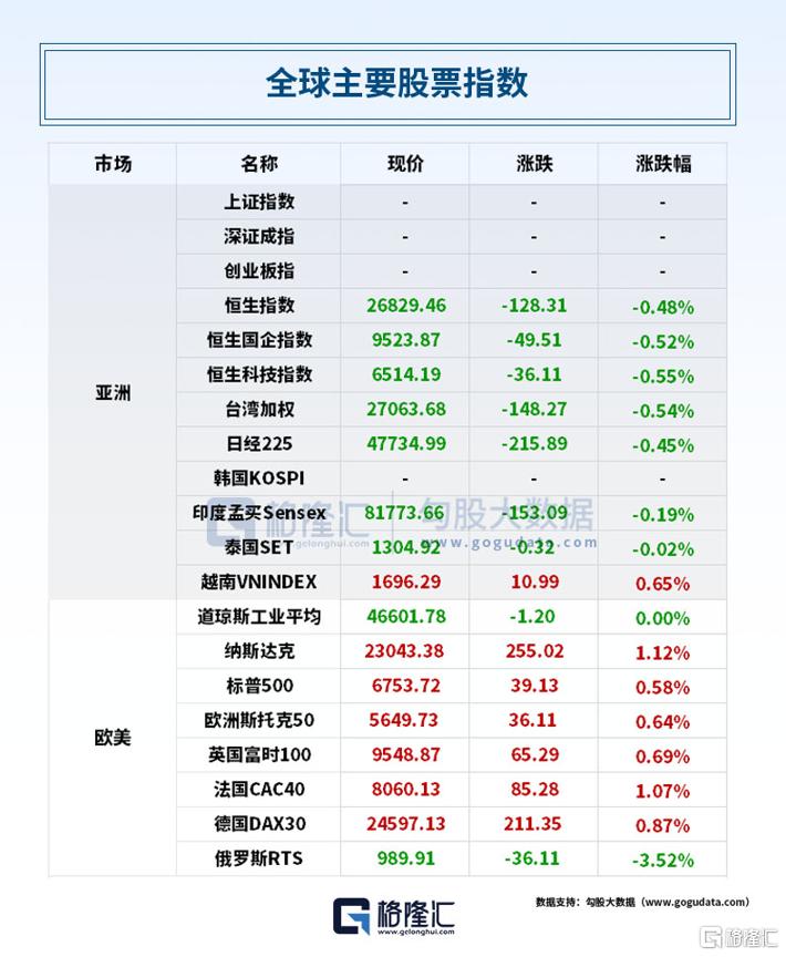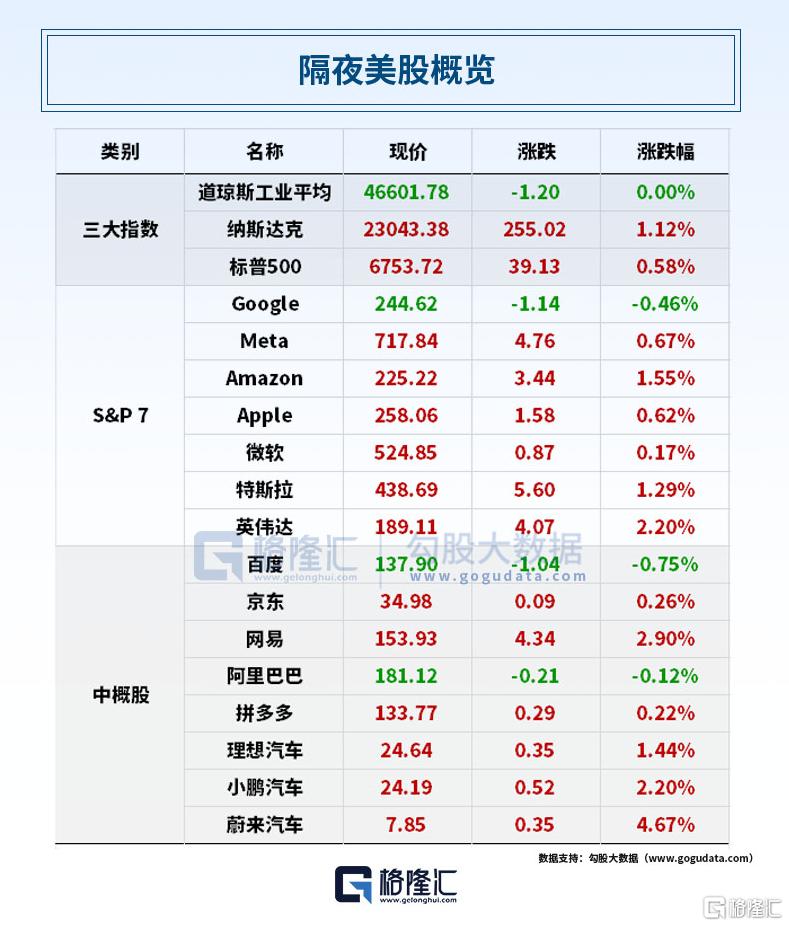 美股方面,纳指涨1.12%,标普500指数涨0.58%,两者均创收盘新高;道指收平。