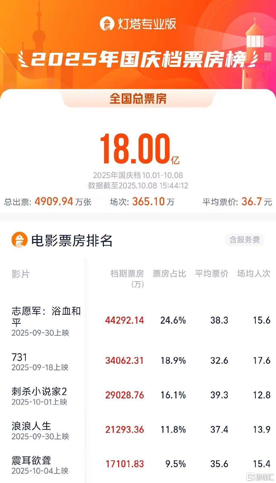 据灯塔专业版实时数据,截至10月8日15时44分,2025年国庆档(10月1日-10月8日)档期总票房突破18亿。《志愿军:浴血和平》《731》《刺杀小说家2》《浪浪人生》《震耳欲聋》暂列票房前五名,且各片档期票房均突破1亿元。