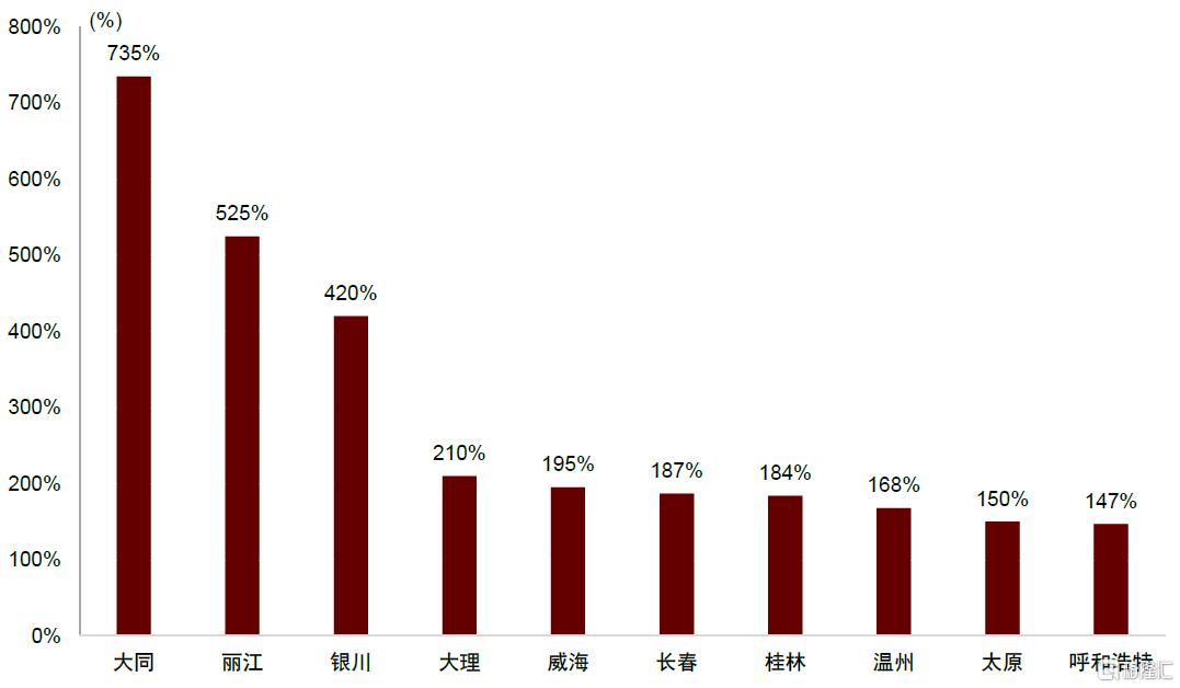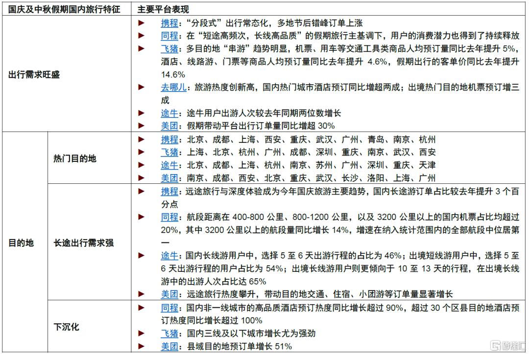 ► 今年国庆中秋假期国内旅游表现亮眼。今年国庆中秋8天假期分段式出行较多,多地节后错峰订单上涨;飞猪数据显示多目的地“串游”趋势明显,机票、用车等交通工具类商品人均预订量同比去年提升5%,酒店、线路游、门票等商品人均预订量同比去年提升4.6%,假期出行的客单价同比去年提升14.6%;去哪儿平台上国内热门城市酒店预订同比增超两成;途牛用户出游人次较去年同期两位数增长;美团平台上出行订单量同比增超30%。长途出行需求强劲,携程远途游占比提升,同程长航段机票增长快,美团远途游带动相关订单增长。同时,下沉趋势显著,同程非一线城市酒店预订火热,飞猪三线及以下城市增长猛,美团县域目的地预订单增超五成。