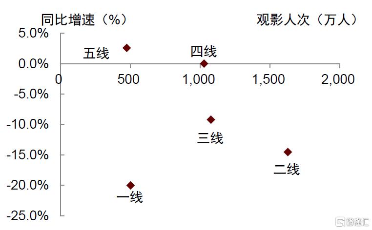 图表:2025年国庆档各线城市观影人次及同比增速:五线城市观影人次同比上升,其他城市有所下降或持平