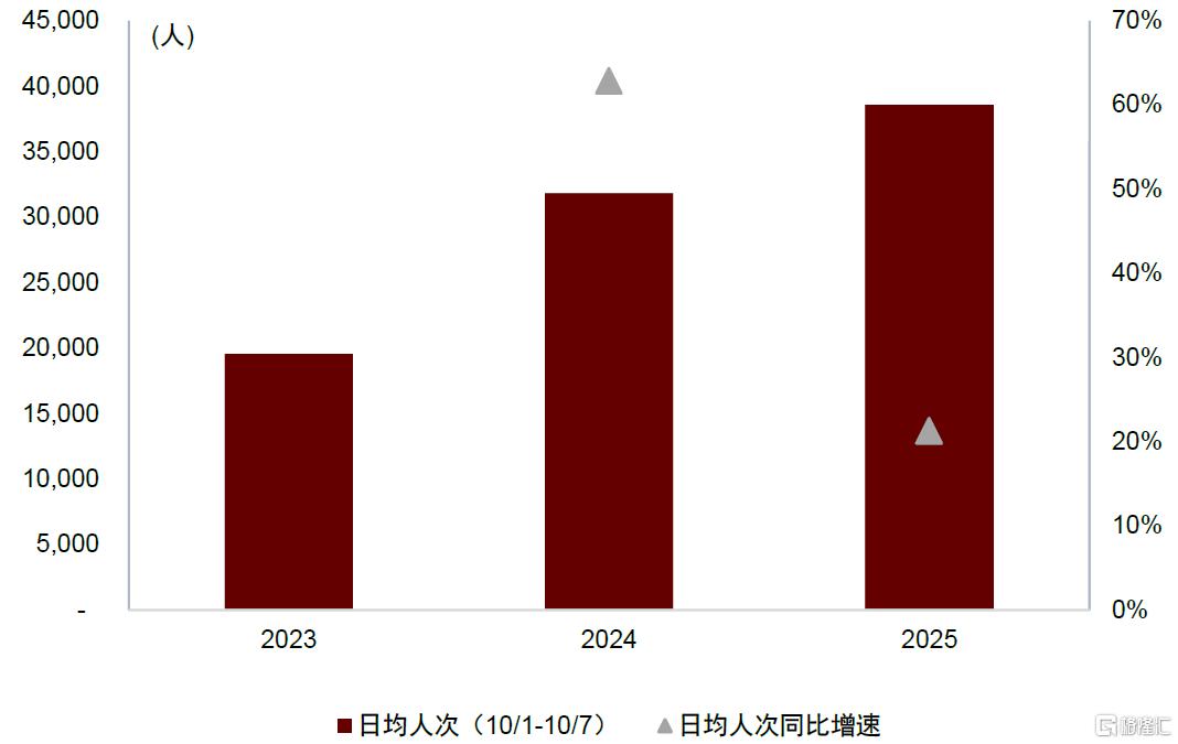 图表:2023-2025年国庆假期前七天上海迪士尼度假区日均人次及同比增速