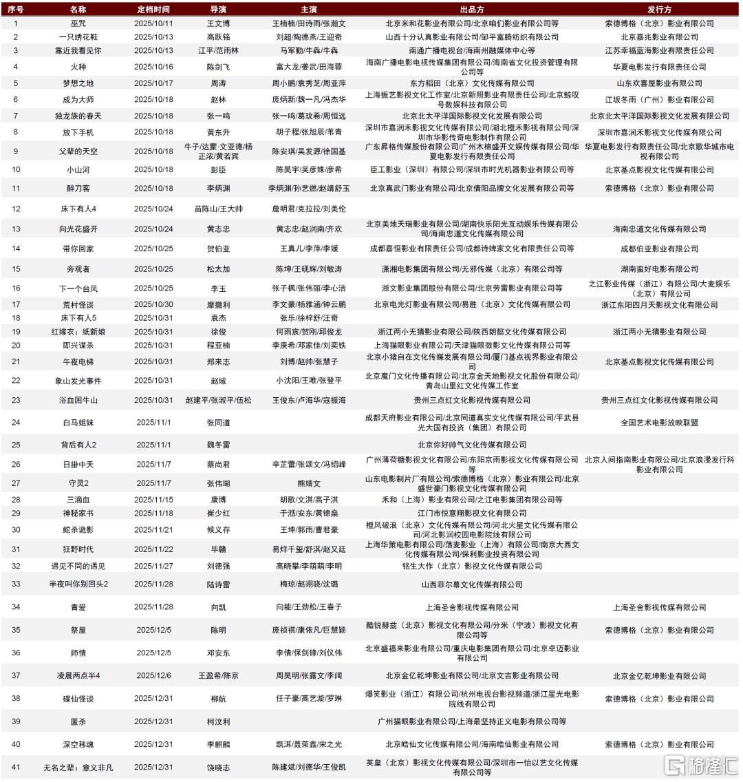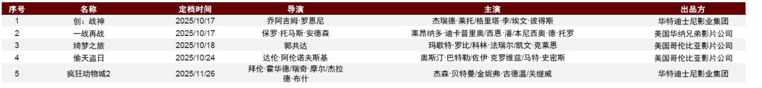 关注年末重点进口影片表现。中金研究认为,优质内容供给仍是提振观影需求的关键要素。展望后续,根据猫眼专业版,已定档国产影片包括《即兴谋杀》(10/31)、《无名之辈:意义非凡》(12/31)、《匿杀》(12/31)等;进口影片包括《创:战神》(10/17)、《疯狂动物城2》(11/26)等,确认引进《阿凡达:火与烬》。建议持续关注后续上映影片票房表现,尤其是年末重点进口影片弹性。