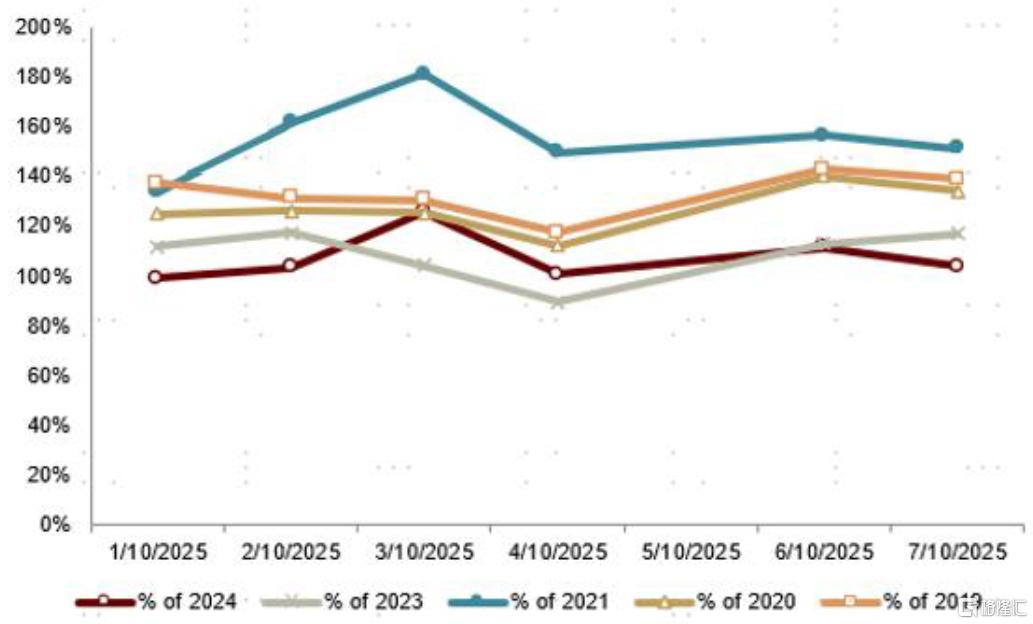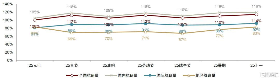 从民航班次的恢复情况来看,根据航班管家的数据,国庆及中秋假期前后的9天(2025年9月29日-2025年10月7日)的航班量恢复至2019年同期的114%(同比增长3%)。其中国内航班量恢复至2019年的119%(同比增长2%),国际航班量恢复至2019年的92%(同比增长10%),地区航班量恢复至2019年的83%(同比增长11%)。