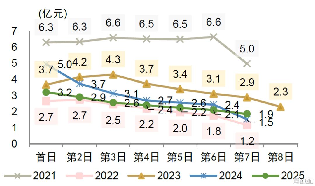 图表:2021~2025年国庆档单日票房:2025年国庆档单日票房均同比下降