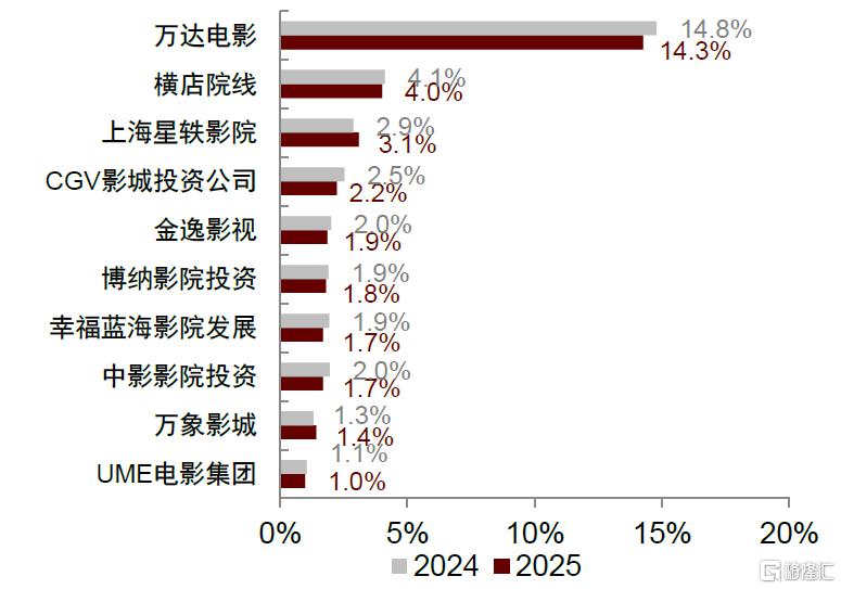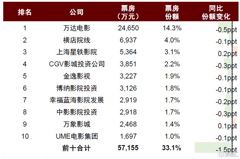 档期影片票房较为均衡,渠道端竞争格局基本稳定。内容端:截至10月7日,由中国电影主控出品的《志愿军:浴血和平》实现票房为4.28亿元,票房占比24.8%,《731》《刺杀小说家2》分别位列第二和第三,票房占比分别为19.2%和16.2%。今年档期单部影片票房均未超5亿元(2024年同期有1部),且1~3亿元影片数量居多,头部影片欠缺。渠道端:影投前十名合计市场份额为33.1%,同比略有下降。中金研究判断,当前影院竞争格局相对稳定。