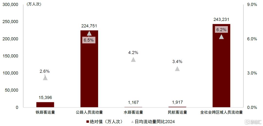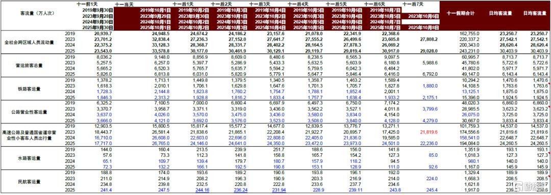 2025年国庆及中秋全社会跨区域日均流动量超预期,同比增速好于今年假期。据中国交通运输部,10月1日至8日(国庆中秋假期),累计全社会跨区域人员流动量预计达到24.32亿人次,创历史同期新高;日均3.04亿人次,同比(2024年国庆假期7天日均)增长6.2%,好于此前交通运输部的预期(国庆及中秋假期预计全社会跨区域人员流动量将达23.6亿人次,日均约2.95亿人次,比2024年同期增长约3.2%)。全社会跨区域人员流动量同比增速好于今年春节、春运、清明、五一、端午及暑期。其中: