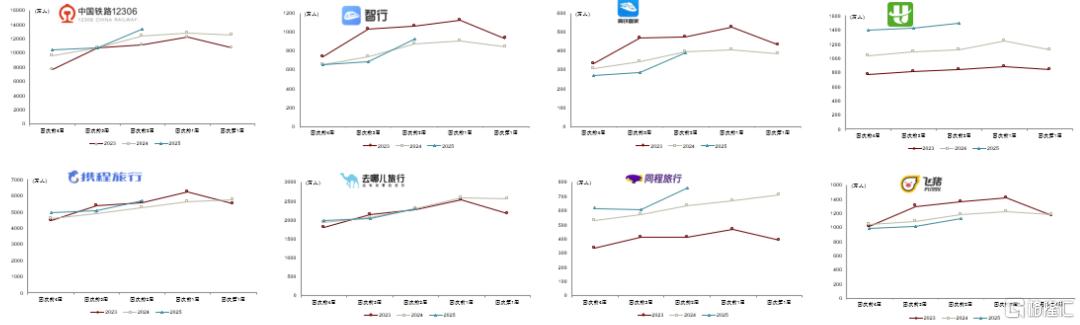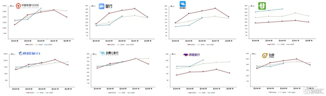 根据QuestMobile数据,2025年国庆及中秋假期前夕携程、去哪儿、同程、飞猪的周度活跃用户数WAU分别同比增长6%、同比持平、同比增长14%、同比下降5%;从火车票预定平台的数据来看,线上预定持续渗透,12306 WAU同比增长6%;携程、去哪儿、同程、飞猪的日度活跃用户数DAU分别同比增长9%、同比增长1%、同比增长11%、同比下降4%,12306 DAU同比增长2%。