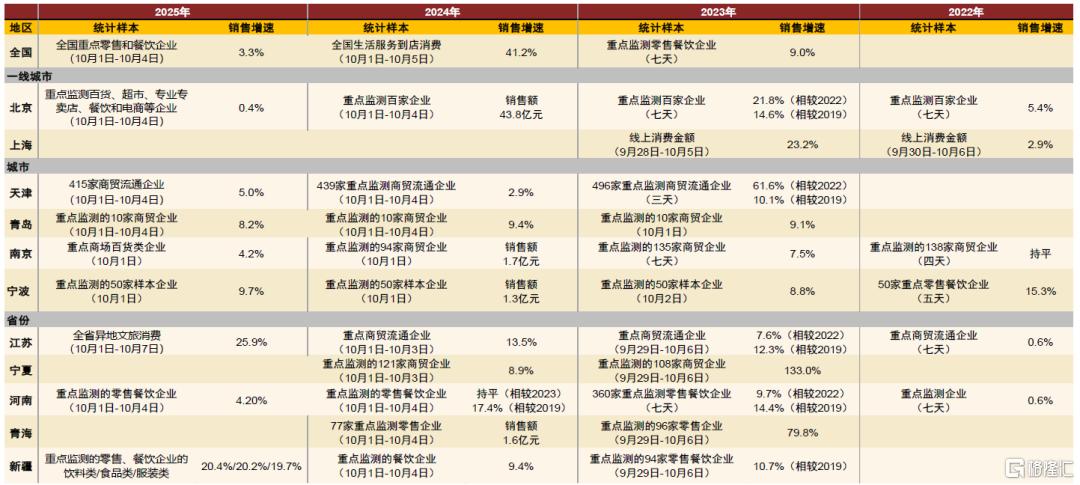 图表:2022-2025年国庆假期国内部分省市消费数据统计