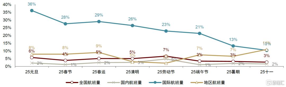 图表:2025年后各假期航班量相比2019年同期的恢复程度