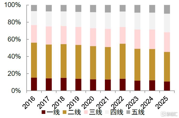 图表:2016~2025年国庆档分城市观影人次分布:2025年三线及以下城市占比54.8%,同比提升3.4ppt