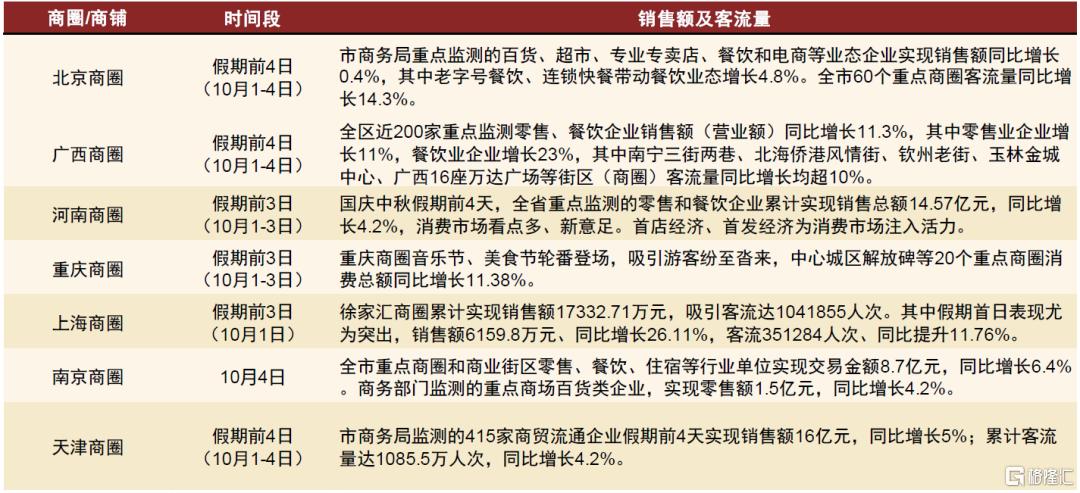 1、出行活力高企,假日消费延续高景气。据交运部,10月1-8日全社会跨区域人员日均流动量同增6.2%,飞猪数据显示假期出行客单价同比提升14.6%,中金研究认为主因出入境游持续恢复,同时国内“长途游”“分段游”占比提升。境内方面,商务部重点监测78个商圈前3日客流/营业额同增4.2%/4.0%,境外方面,国家移民局数据显示全国口岸日均出入境旅客数突破200万人,同增15%。