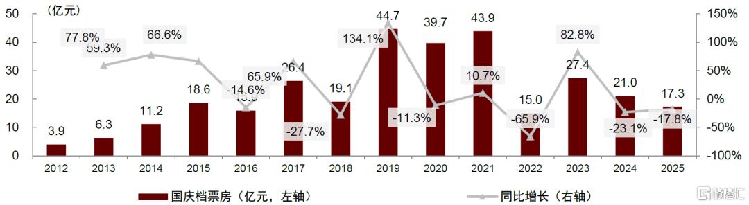 图表:2012~2025年国庆档首日票房及占比:2025年档期首日票房占比18.6%,同比下降