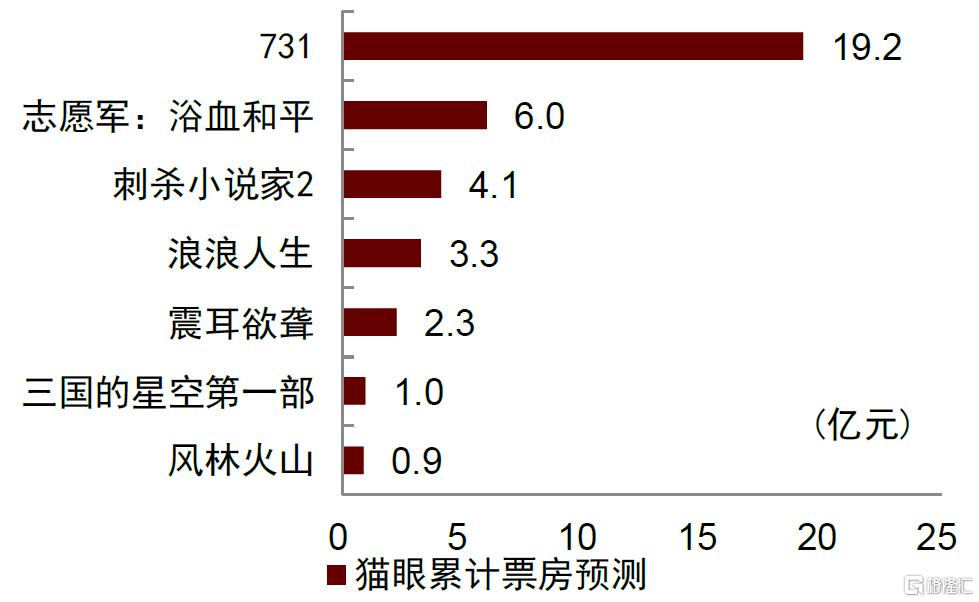 根据艺恩数据,2025年国庆档(10月1日~10月7日)前7天总票房17.3亿元(10月8日上午10时统计,含服务费,下同),同比去年7天总票房下降17.8%,中金研究预计全档期8天票房或低于此前预期的中性情形下的28亿元。影片《志愿军:浴血和平》累计票房超4亿元,位列第一。