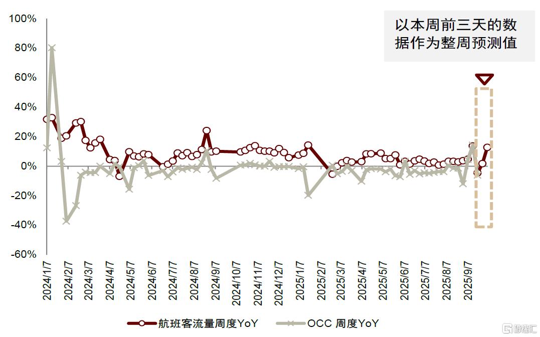 图表:2024年以来航班客流量及OCC周度同比变动趋势