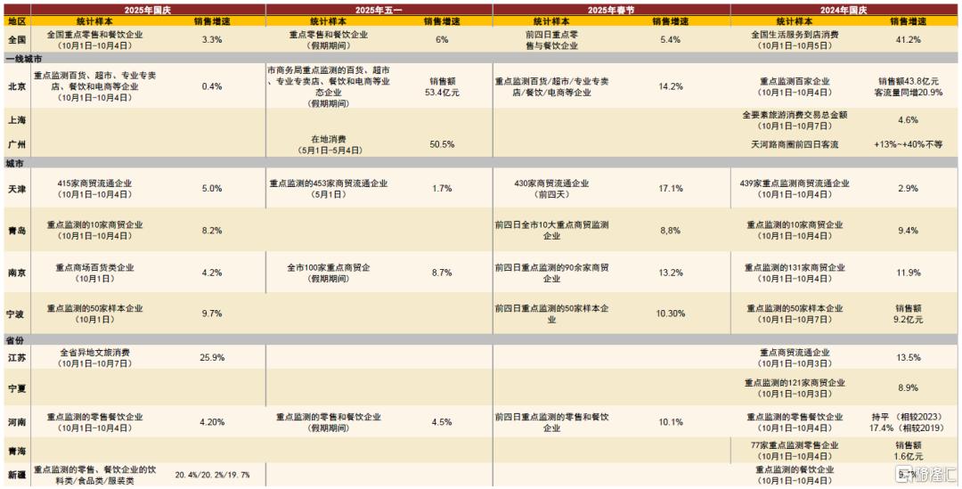图表:2025年国庆及2025年五一、2025年春节、2024年国庆假期国内部分省市消费数据统计