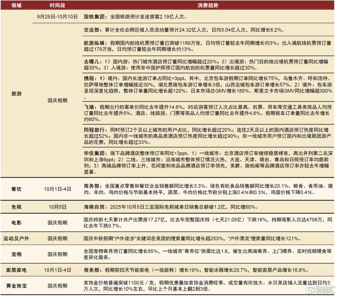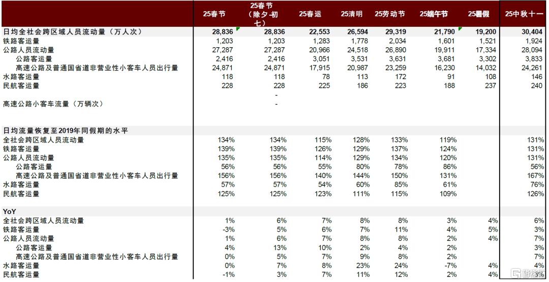 旅游:国庆中秋假期出行人次增速环比五一假期略有回落但仍较良好;远途深度游与情绪体验付费并进。据交通运输部数据,中秋国庆假期(2025/10/1-2025/10/8)全社会跨区域人员流动量日均同比增长约6.2%,其中铁路客运量/公路人员流动量(自驾为主)/水路客运量/民航客运量日均同比增长约2.6%/6.5%/4.2%/3.4%。对比今年“五一”假期(2025/5/1-2025/5/5),中秋国庆假期出行人次增幅环比下降1.7ppt,尤其铁路、水路和民航环比下降幅度较大(“五一”假期全社会跨区域人员流动量同比+7.9%,其中铁路客运量/公路人员流动量/水路客运量/民航客运量同比增长约10.8%/7.6%/23.8%/11.8%)。中金研究认为此次假期出行人次增速环比回落,或部分由于错峰出行比例提升。